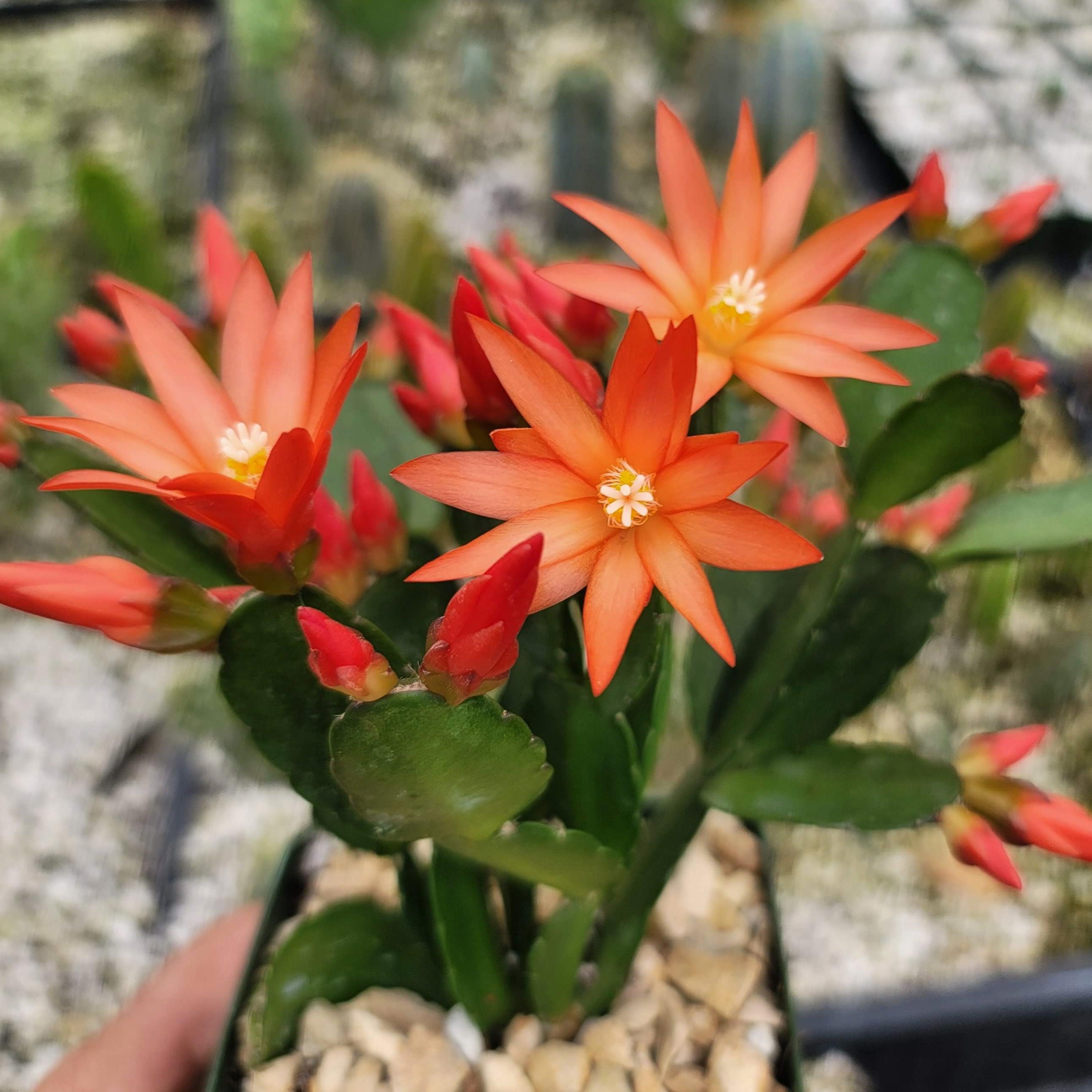 The Easter cactus plant blossoms during early spring when star-shaped bright orange flowers fill the plant all through. These flowers bloom with sunrise.