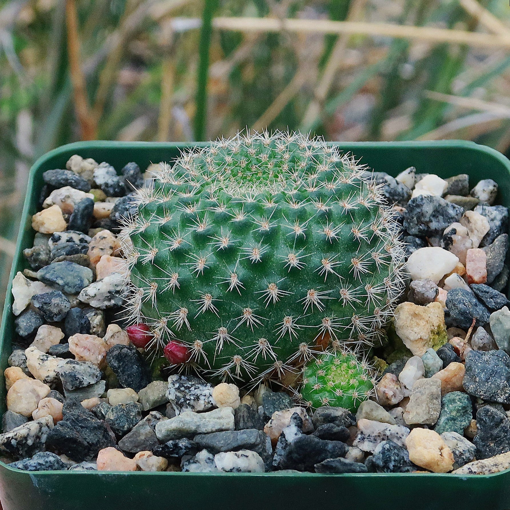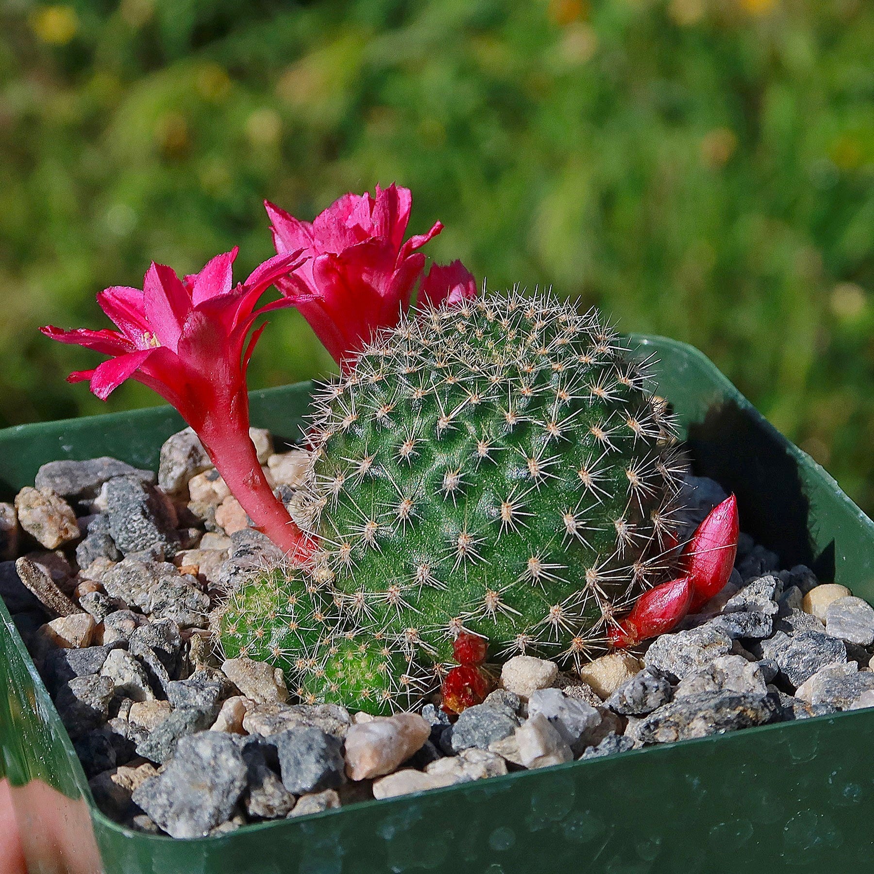 This crown cactus is extremely variable, with pink-violet flowers and glassy-white spines that fall somewhere between the long, flexible spines of Rebutia senilis and the short, bristly spines of . This crown cactus is sure to make a statement in any garden or indoor space, thanks to its striking feature like its full ring of vibrant flowers that bloom through mid-summer. With its unique barrel shape, clumping stem, and golden yellow spines, this cactus is sure to catch your eye.