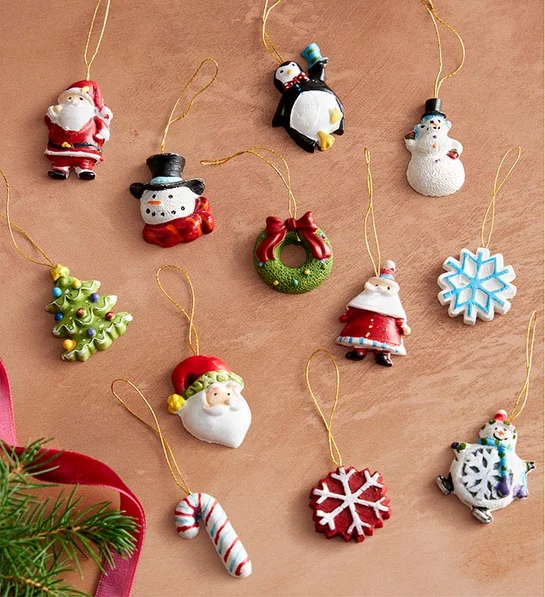 - Set of 12 petite ornaments depicting holiday icons; measures approximately 1” each