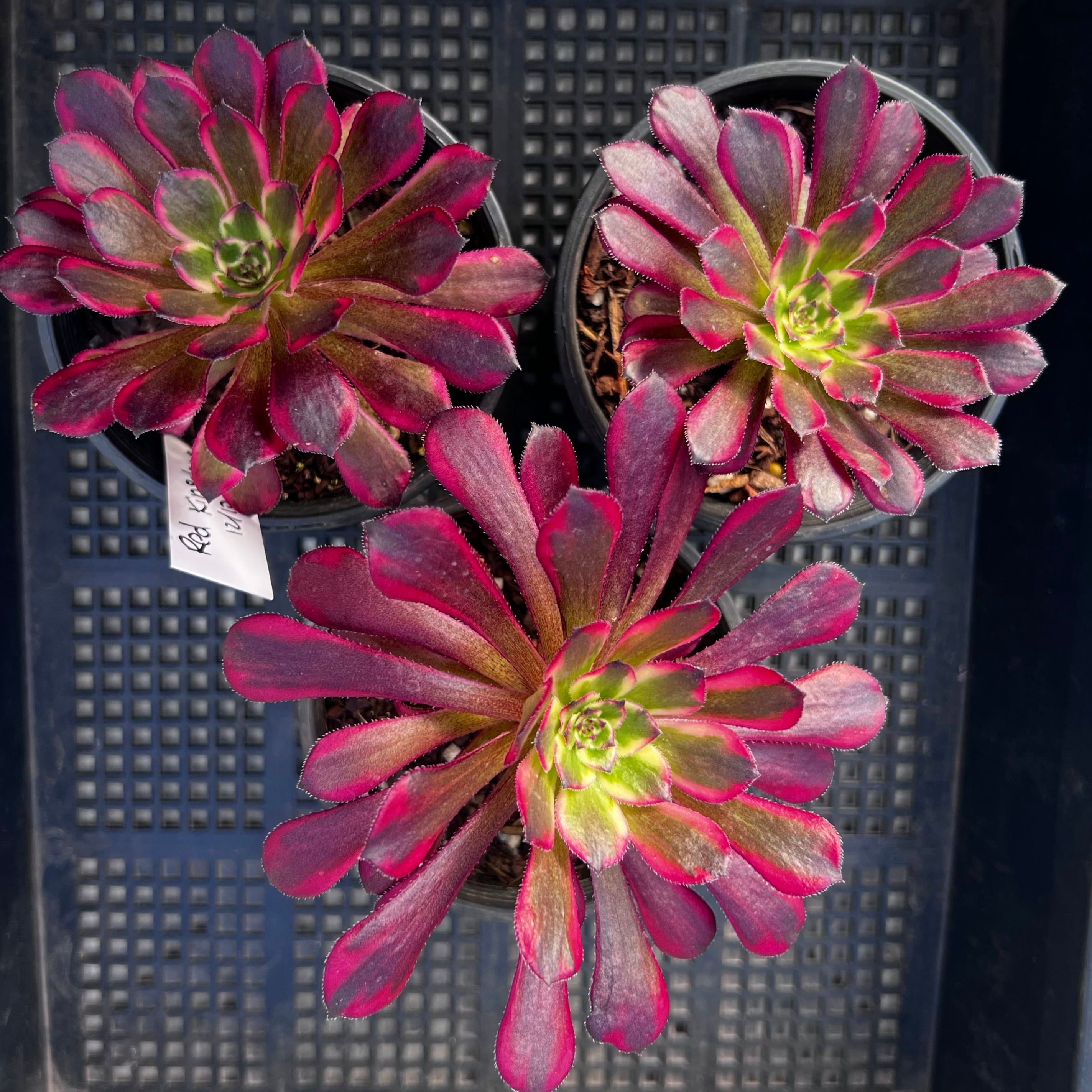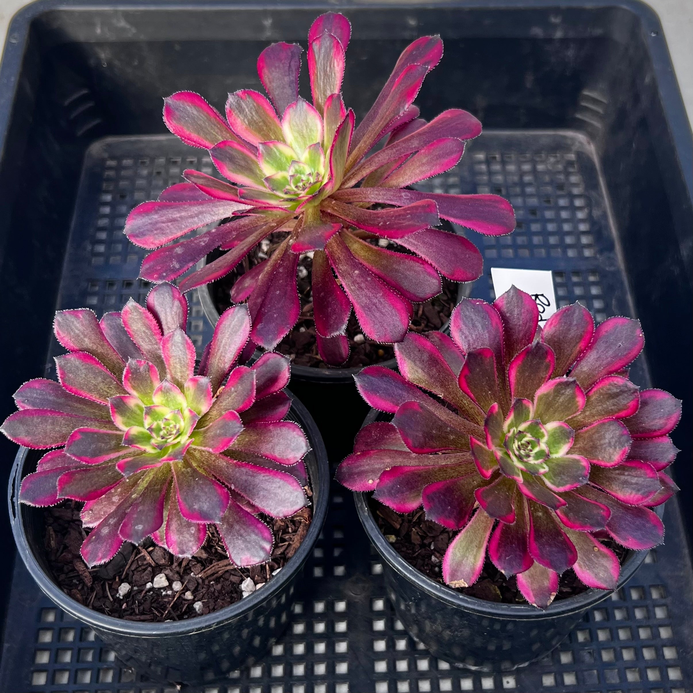 Bold and dramatic! This striking Aeonium features deep burgundy rosettes that darken to near-black in full sun. Perfect for growing in pots or in the garden. Prefers full sun.