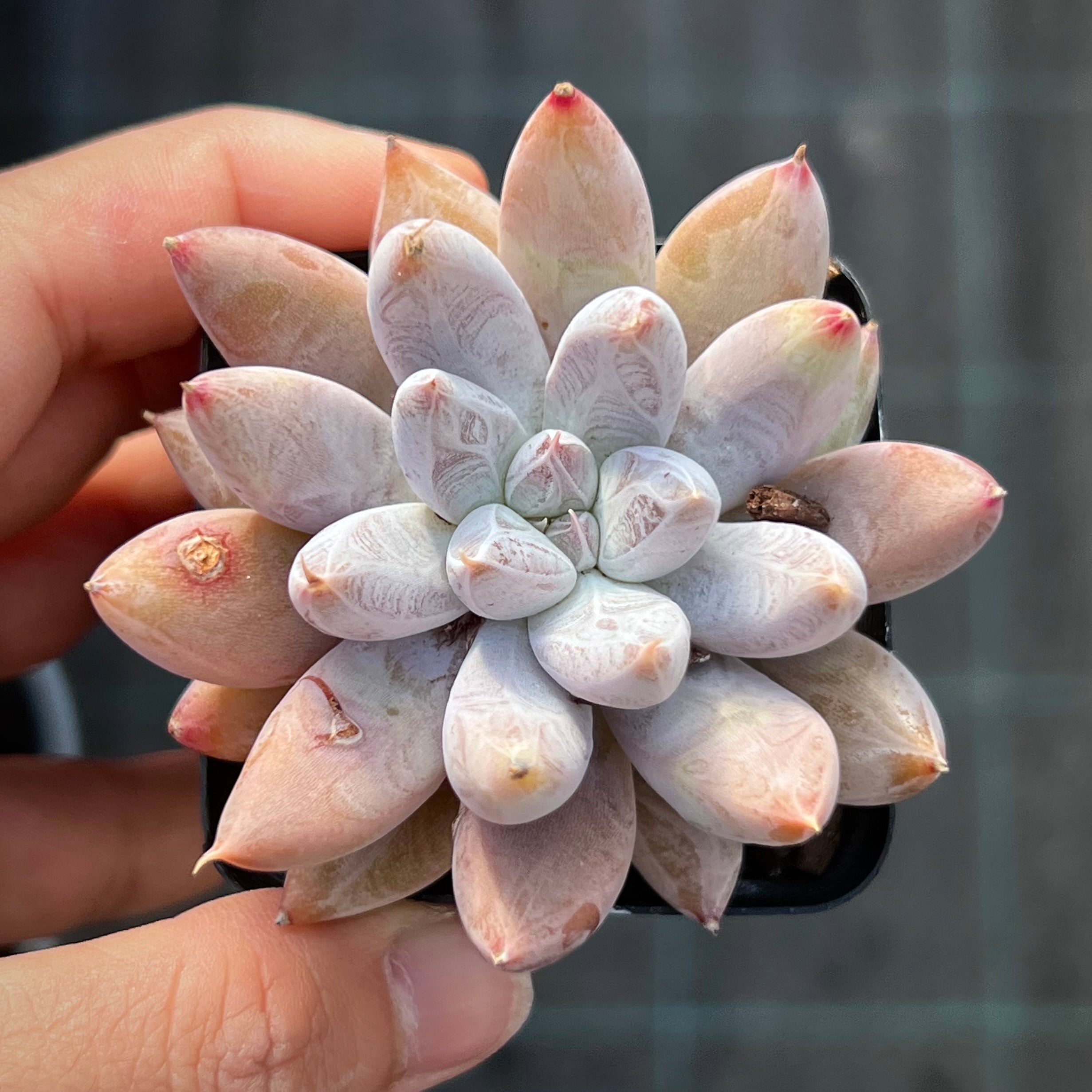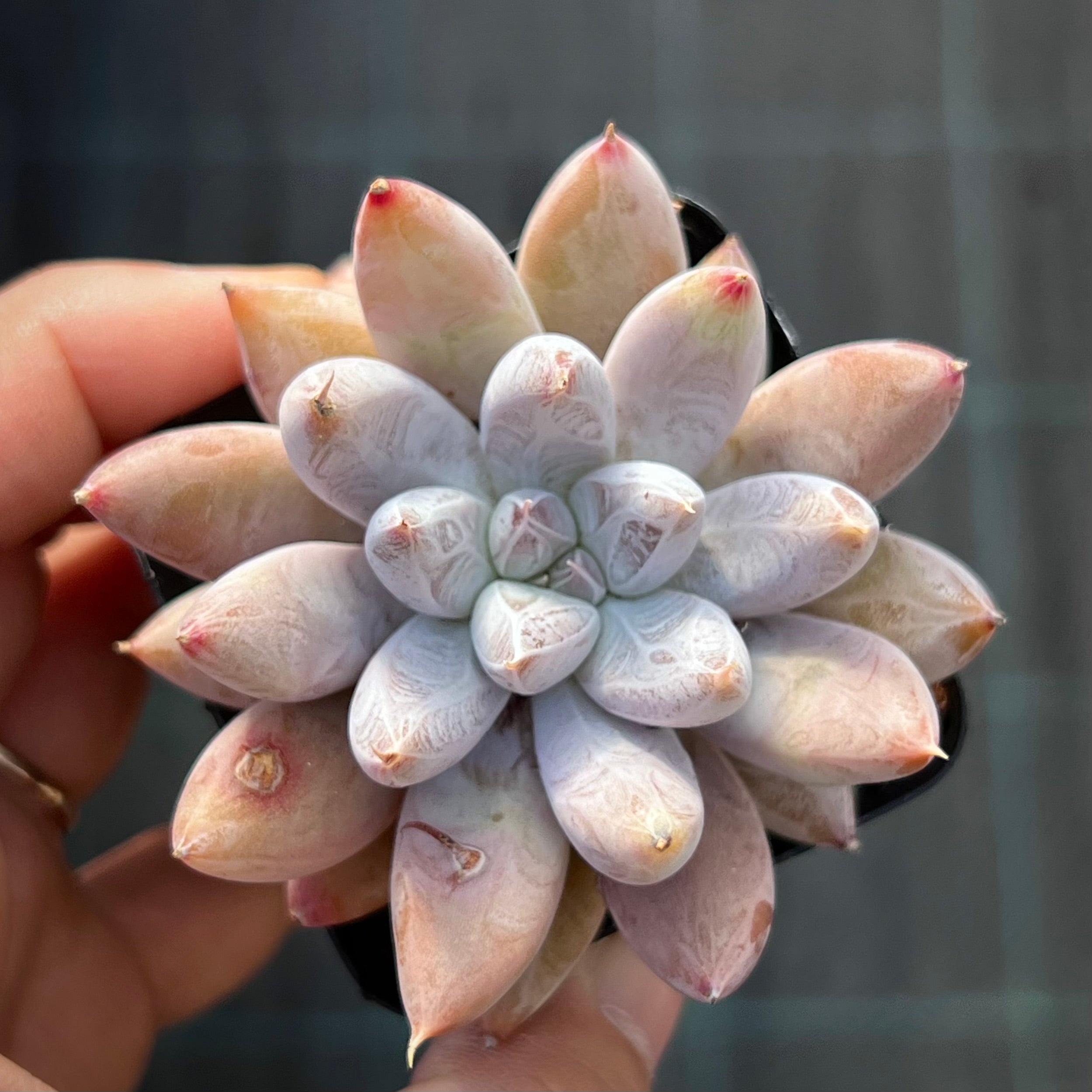 Echeveria Tolimanensis has beautiful markings and fine long tips on chunky frosty leaves. Tolimanensis is also the parent of many very well known and unique hybrids. Prefers full sun.
