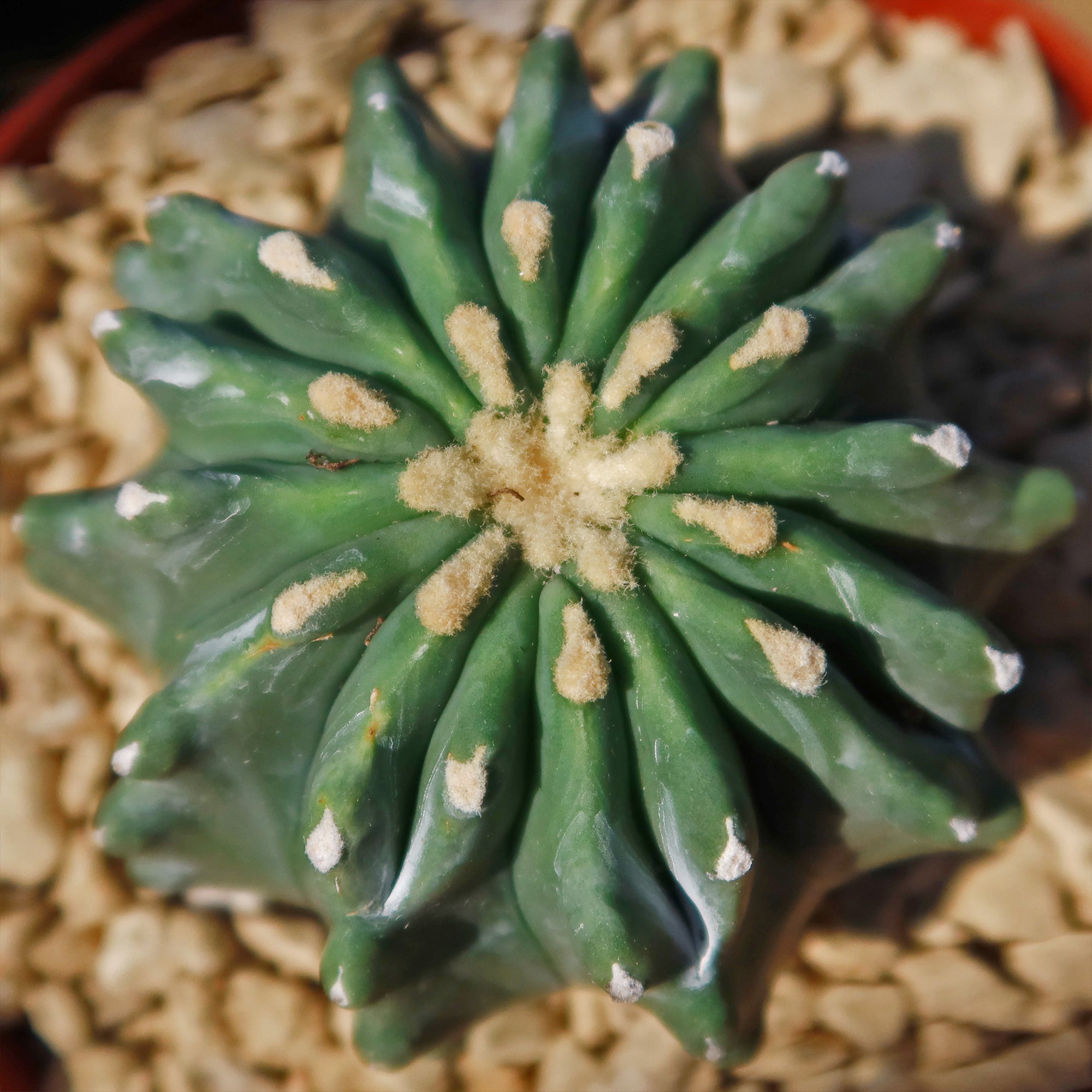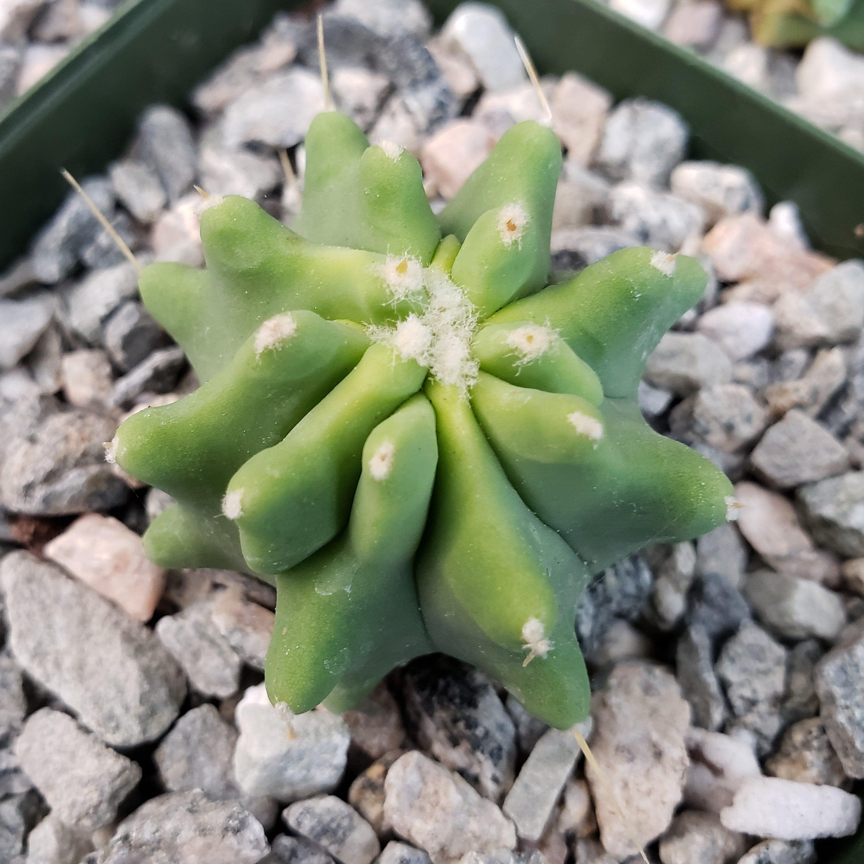 Unlike its prickly cousins, this cactus doesn't have sharp spines on its stems - although you might find some small bristles or bumps here and there. But don't be fooled by its lack of spikes because this desert darling still packs a punch with its distinct blue-green stem color caused by a waxy coating that shields it from the sun's cruel rays.