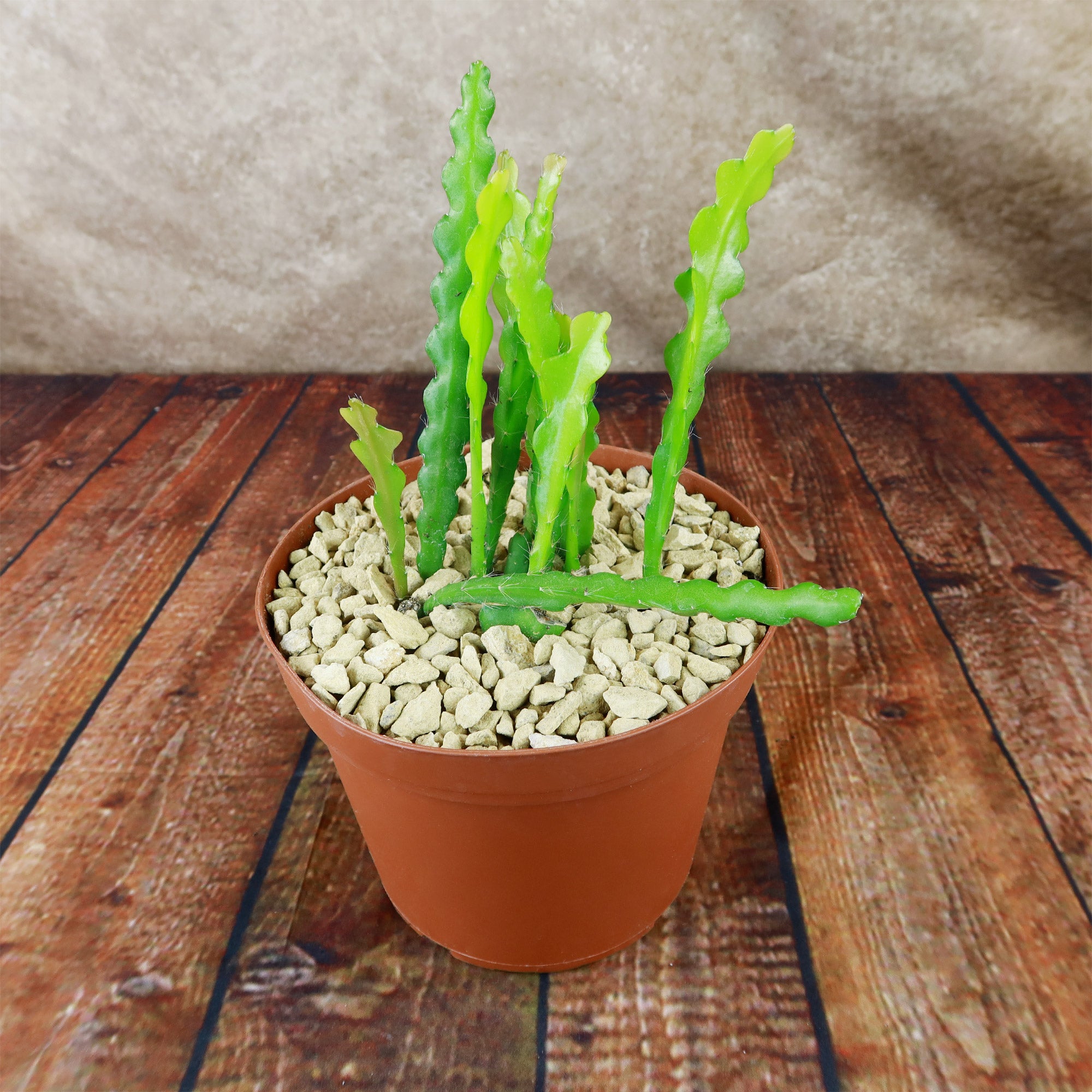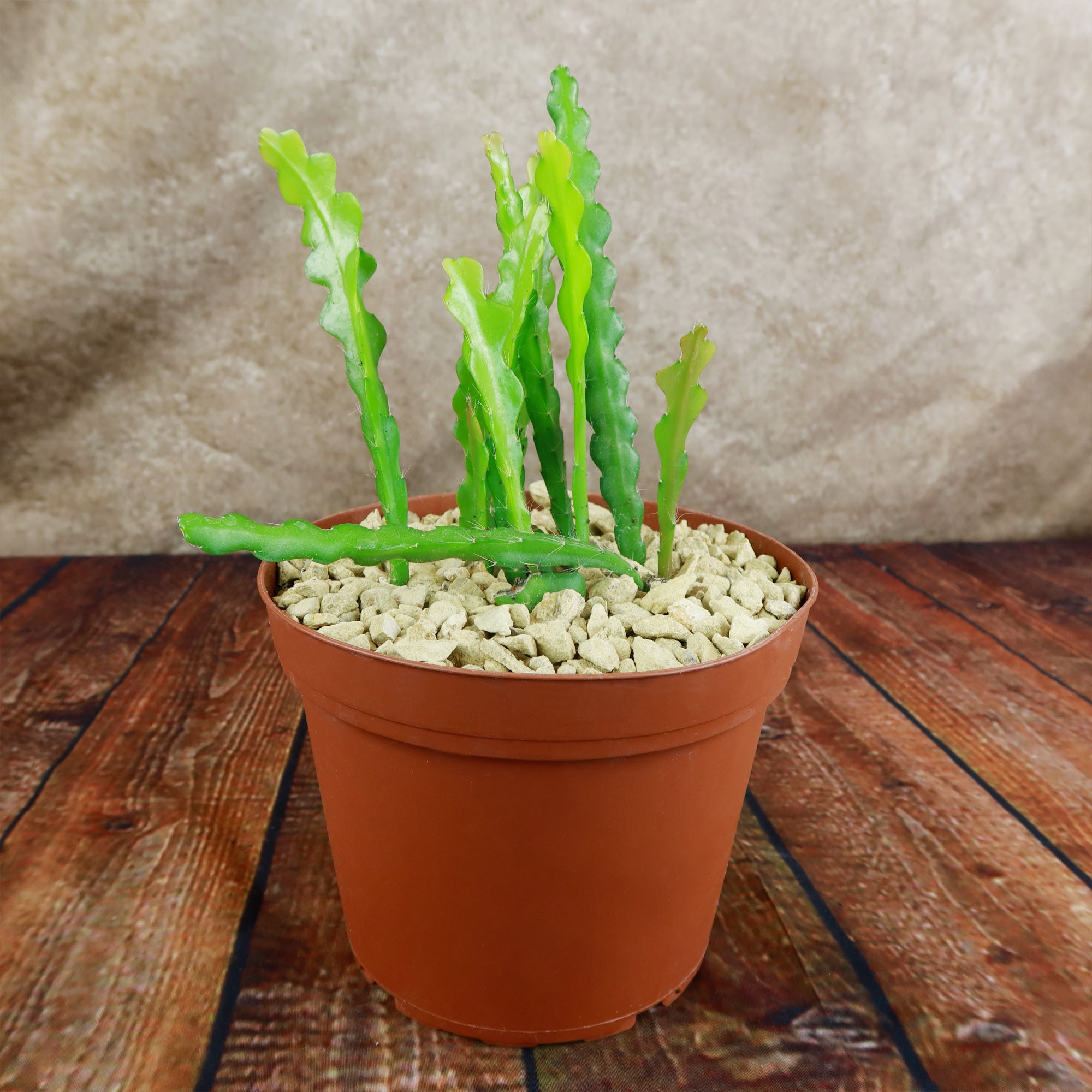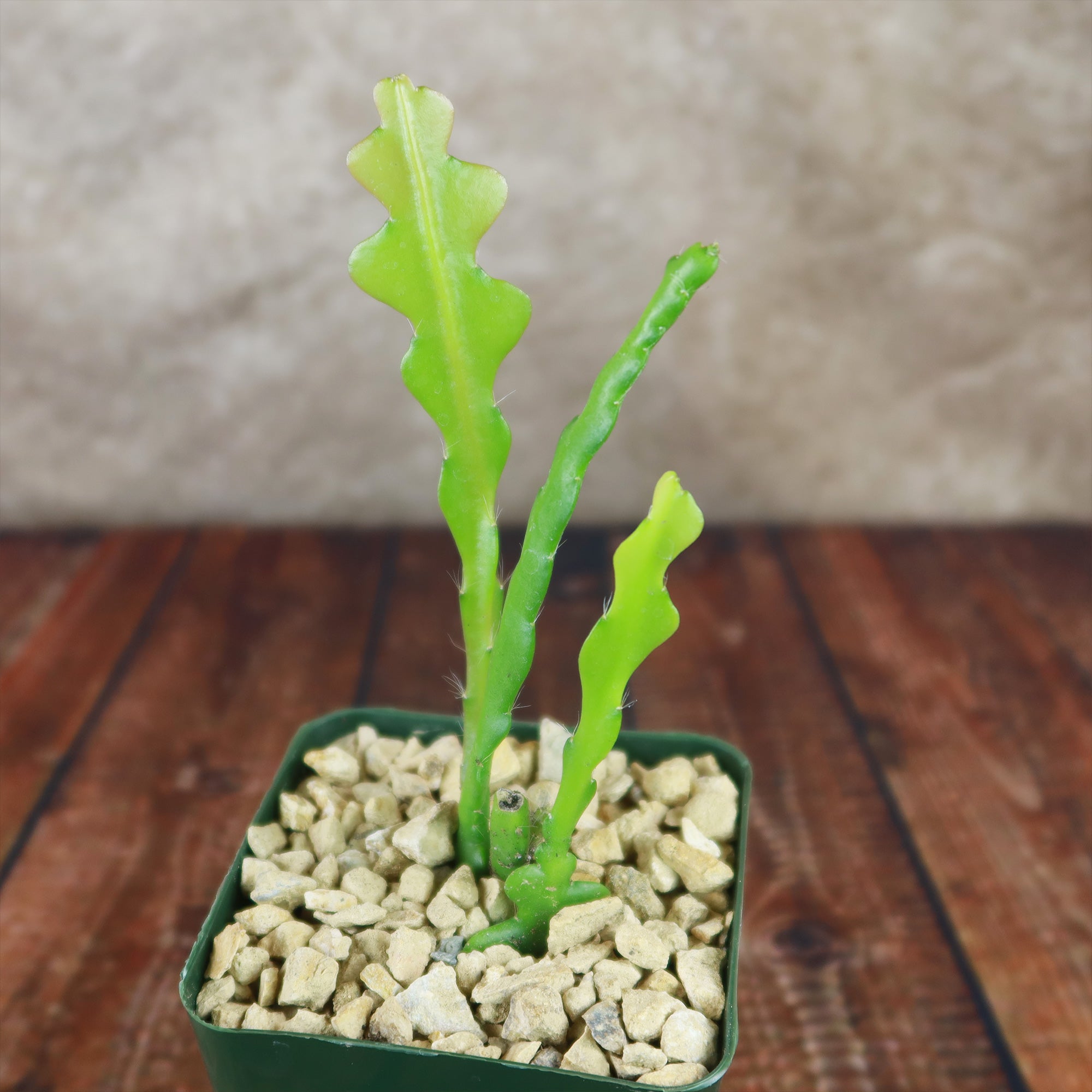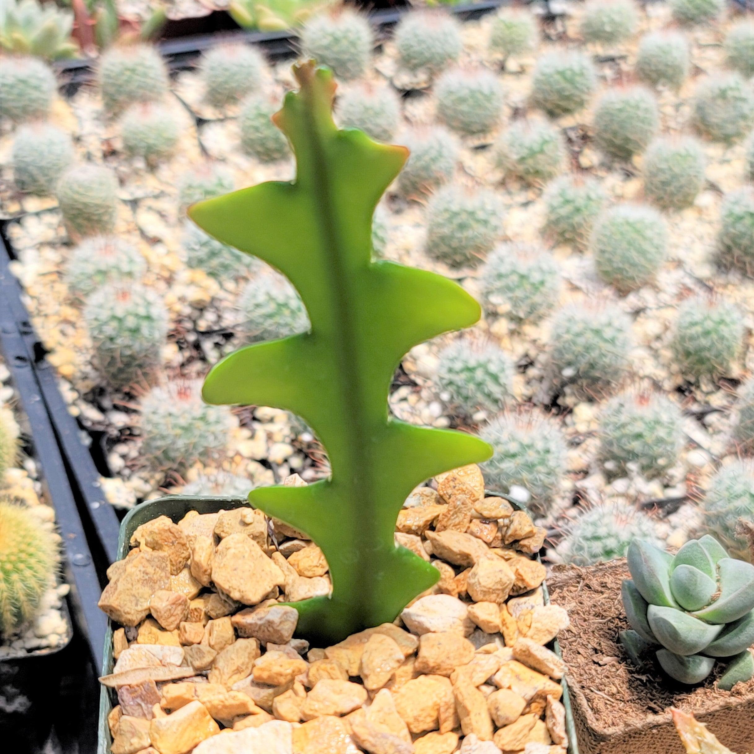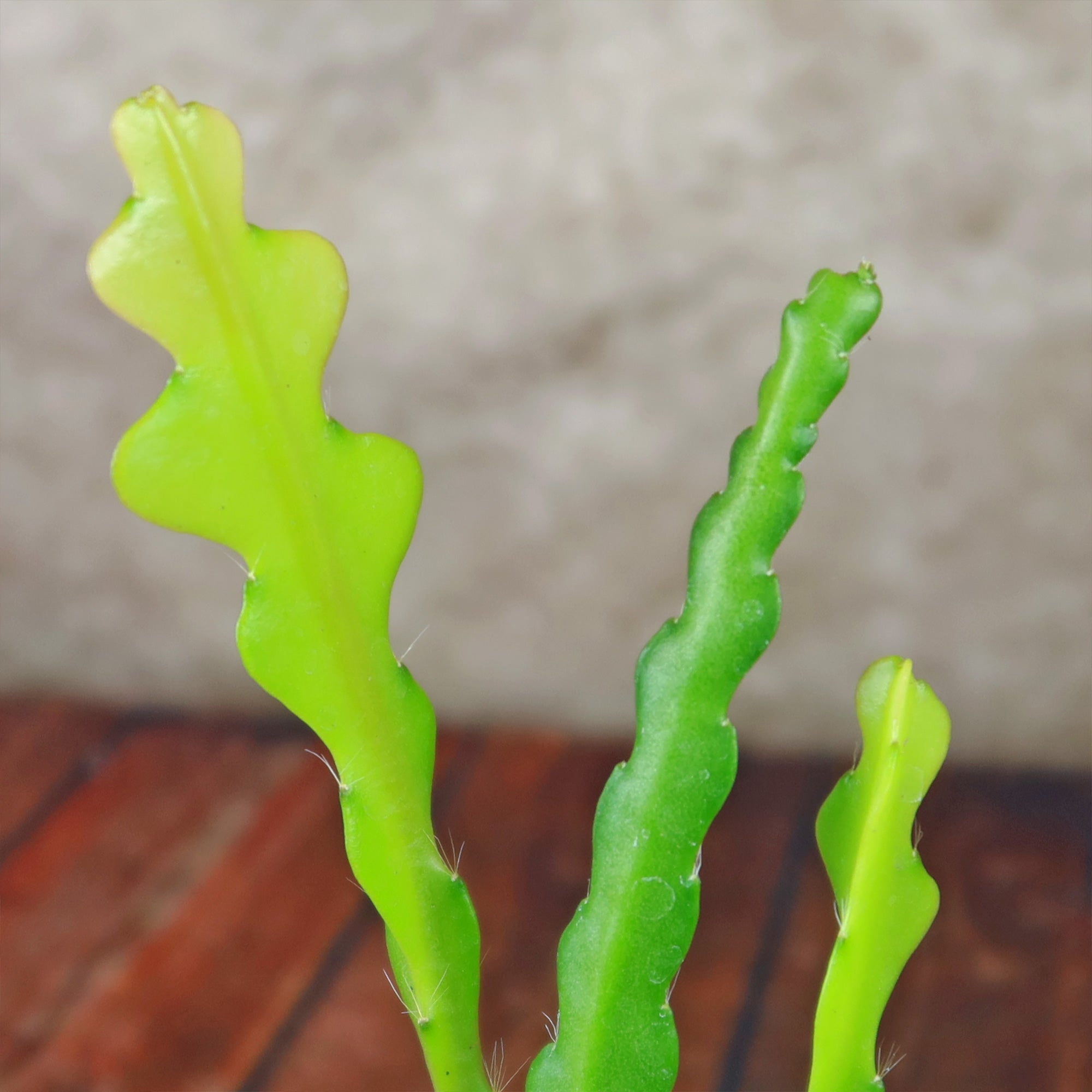 Introducing the fishbone cactus, known as Selenicereus anthonyanus, which is a fast-growing epiphytic cactus with climbing stems. This cactus is named "fishbone" due to the distinct shape of its foliage, which resembles the skeleton of a fish. The leaves are flat, narrow, and deeply serrated, giving them a fishbone-like appearance.