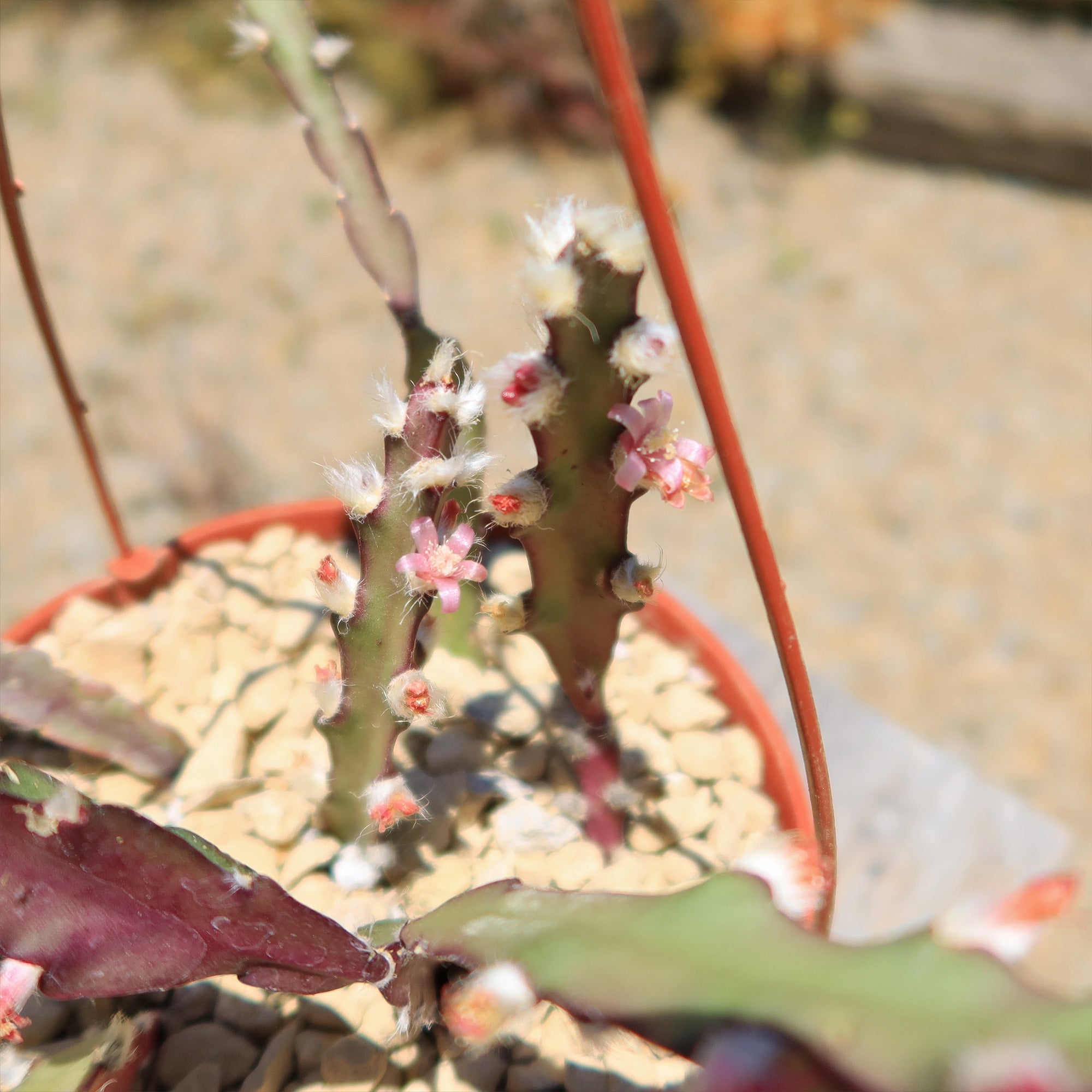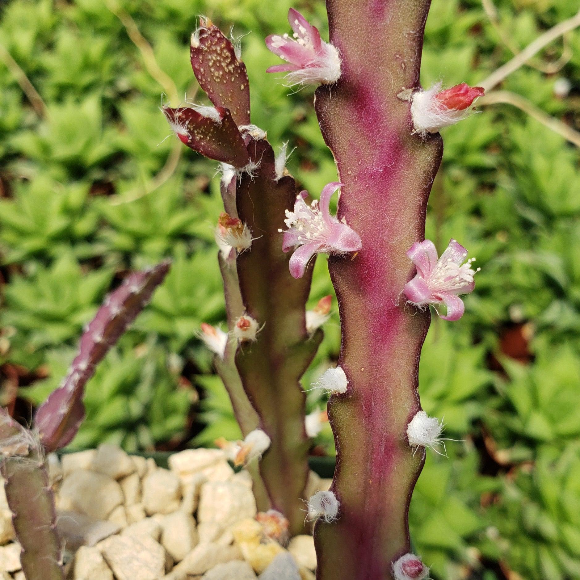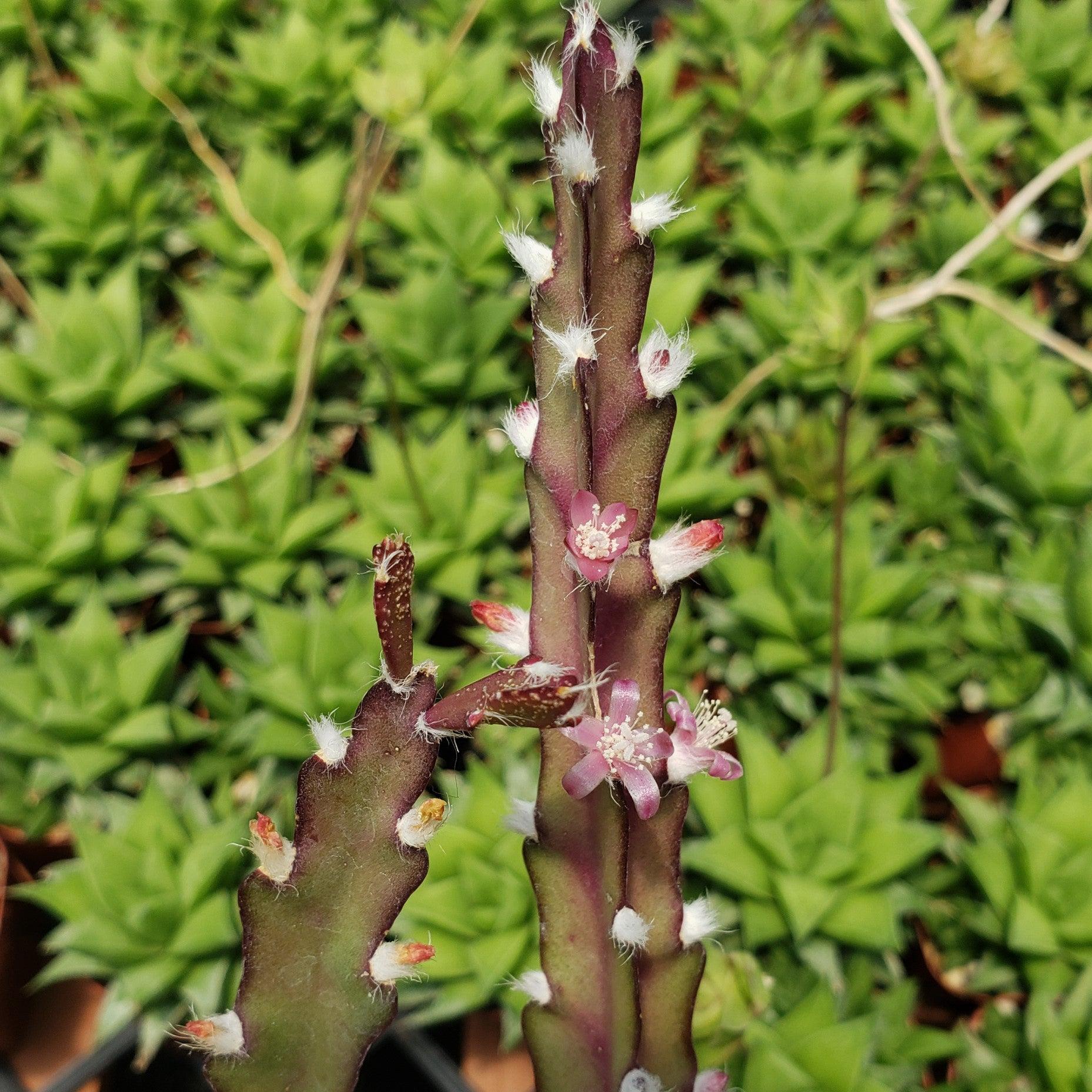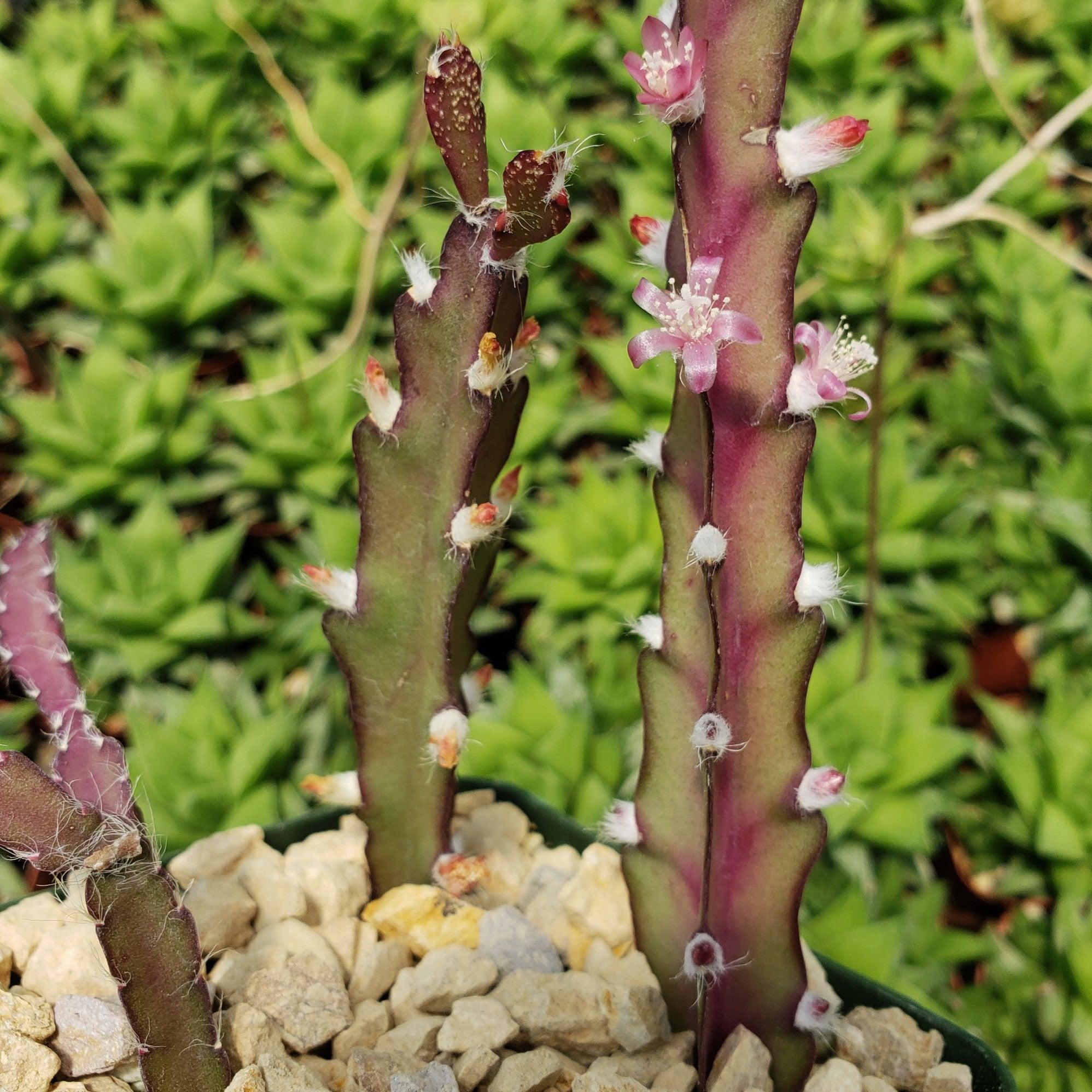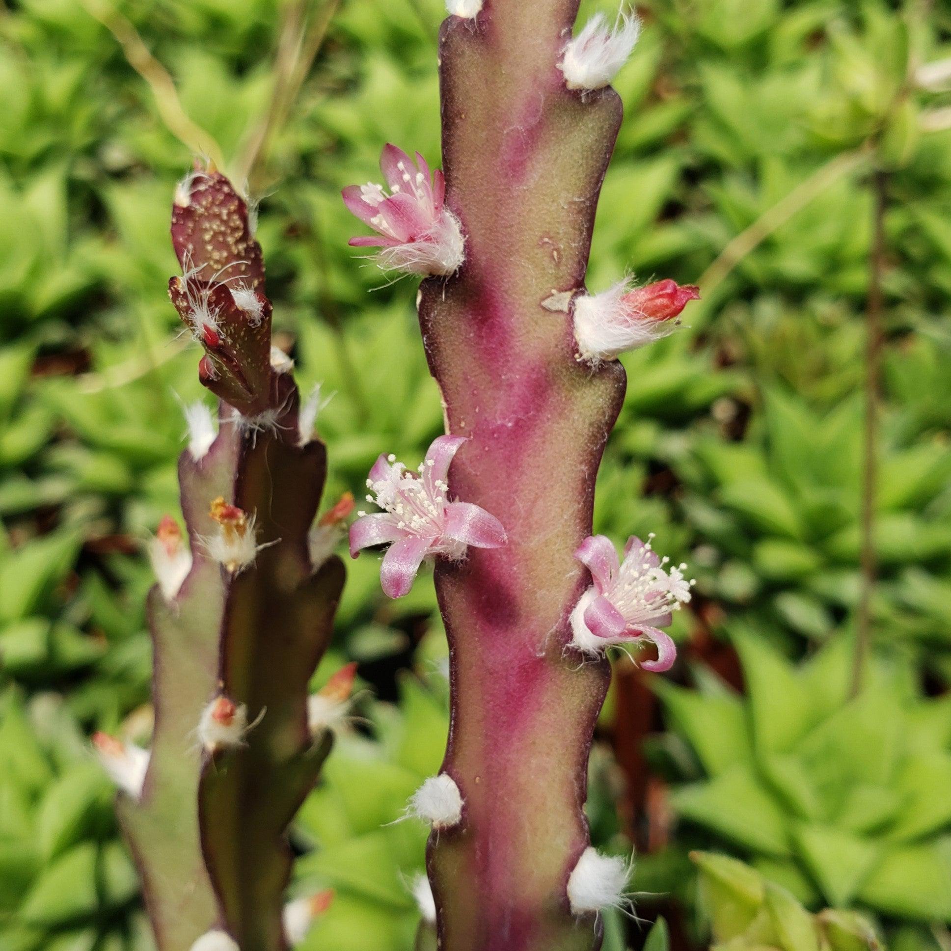 Lepismium cruciforme is an epiphytic cactus , requiring low maintenance, and its roots are not always firmly planted in the ground. These forest cacti tend to live long. This hurricane cactus is olive green under ideal growing conditions but blushes magenta when stressed, giving it the unique name Lepismium cruciformes ‘red tip’. Give it more heat or cold, less water, or fewer nutrients, and you'll get that beautiful hue.