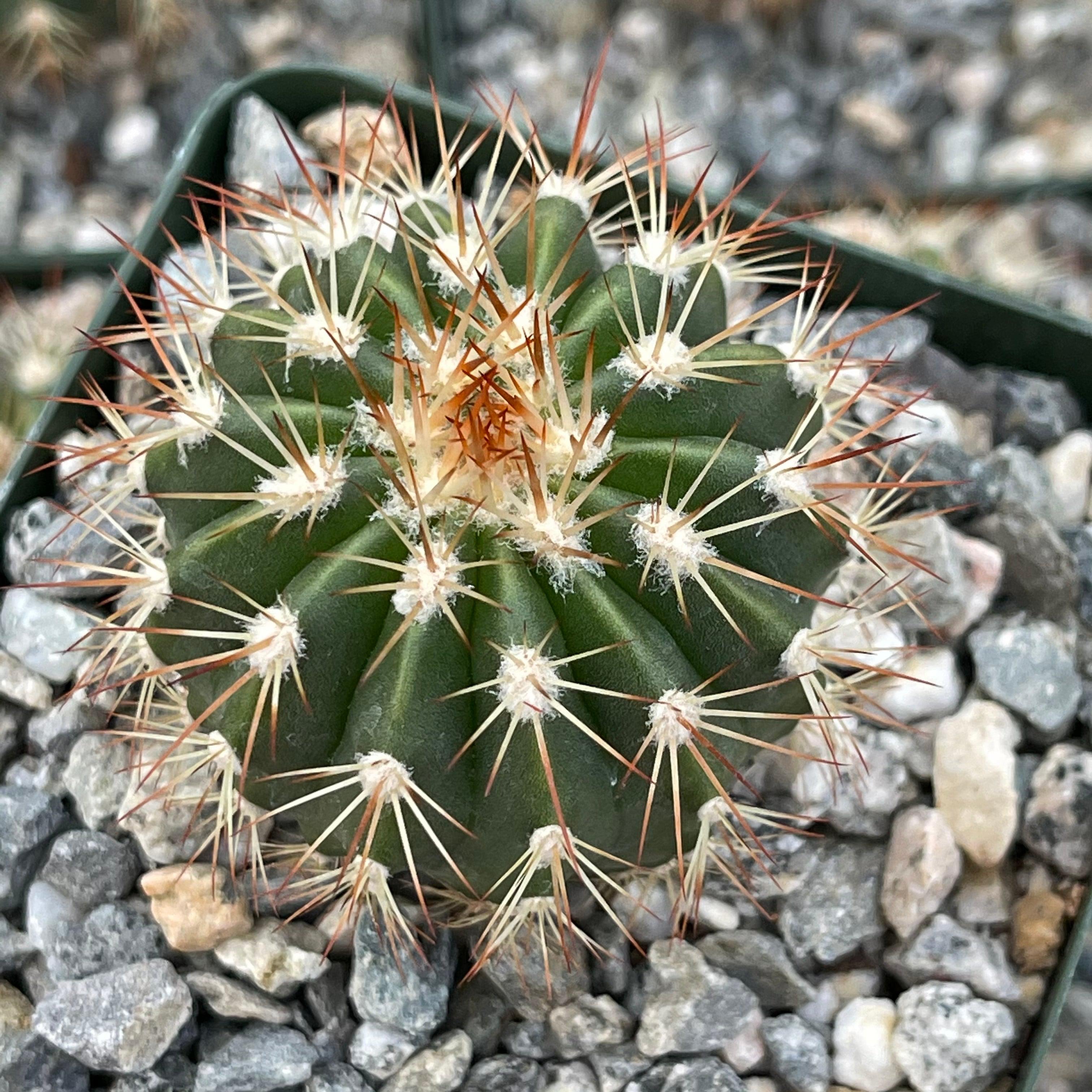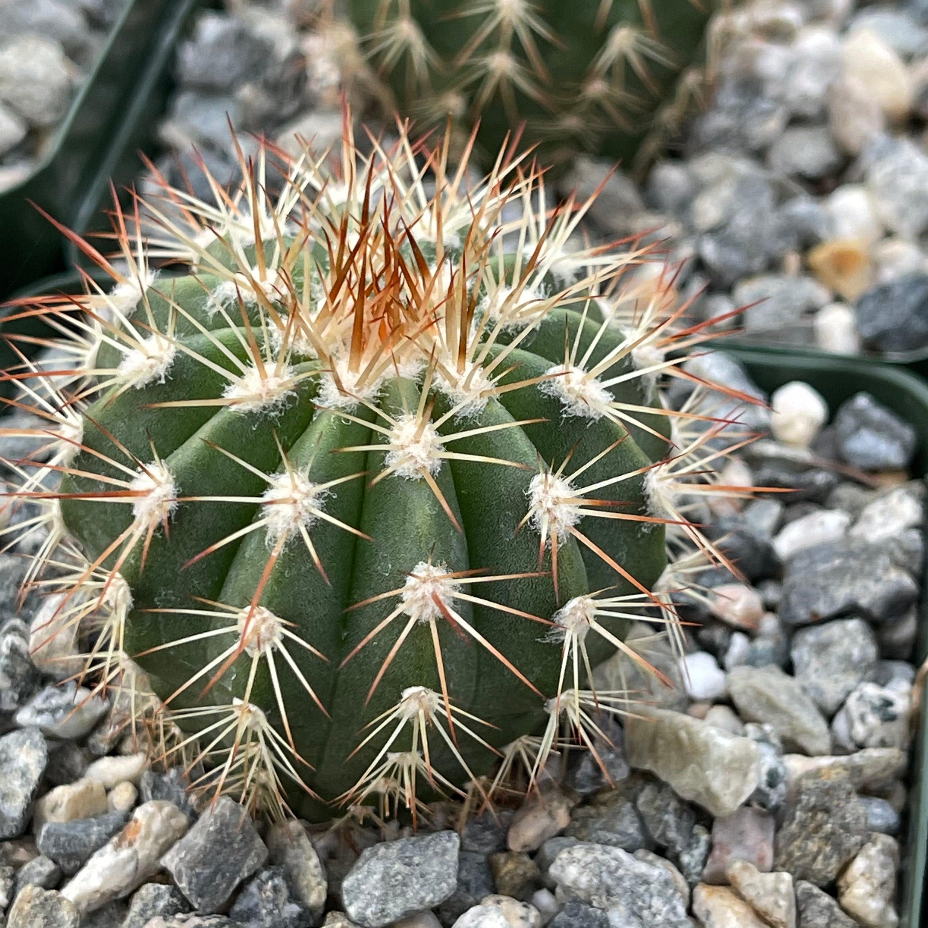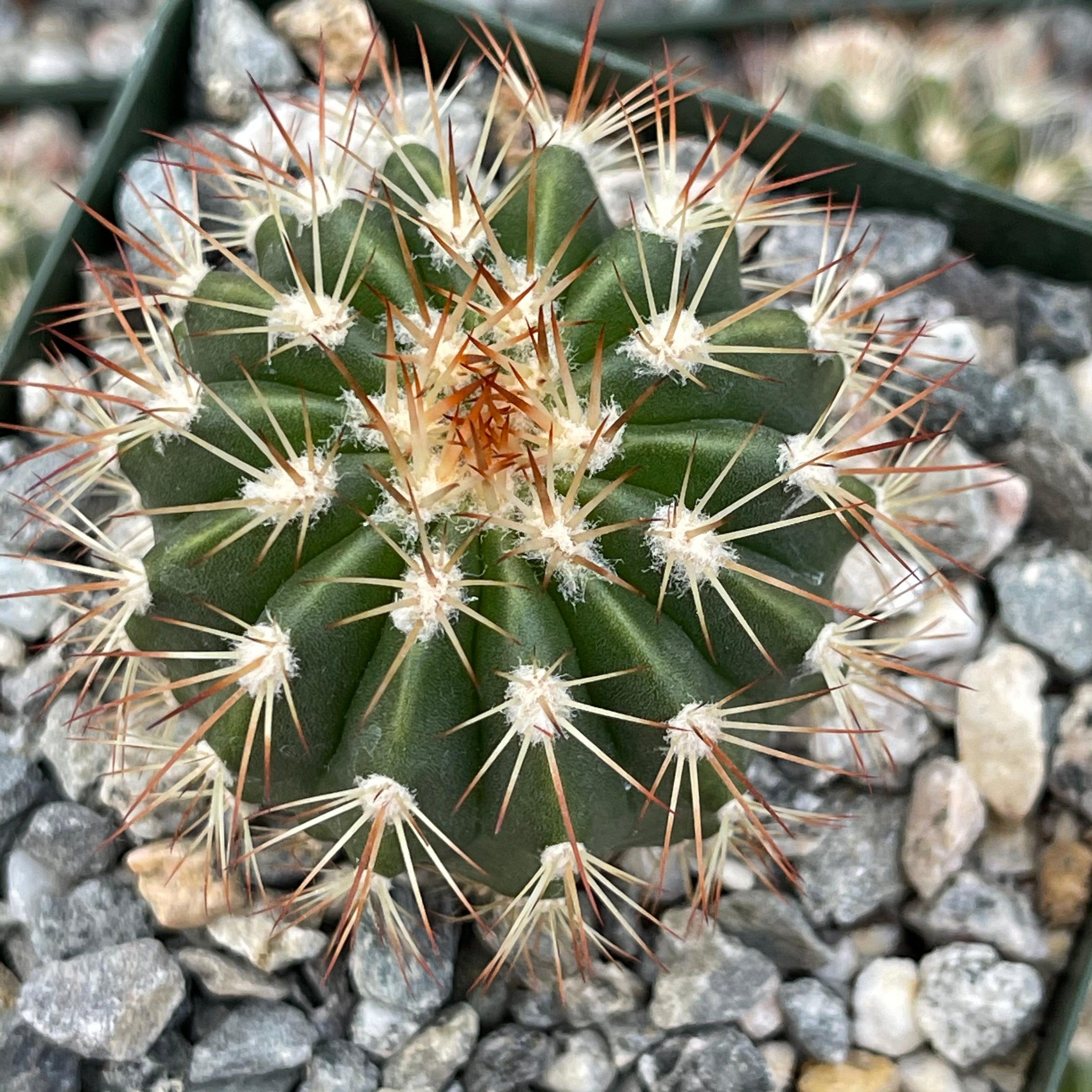 Description: Melocactus guitartii is the the rarest of these Cuban species,. It is about 10 cm broad and 12 cm high, densely armed with long spreading rigid spines.
