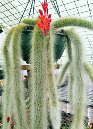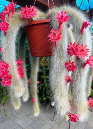 - The Monkey Tail Cactus is an excellent choice for hanging baskets, thanks to its long, trailing stems covered in soft, silvery-white spines. Its cascading growth habit creates a stunning visual display, especially when adorned with its vibrant red flowers.