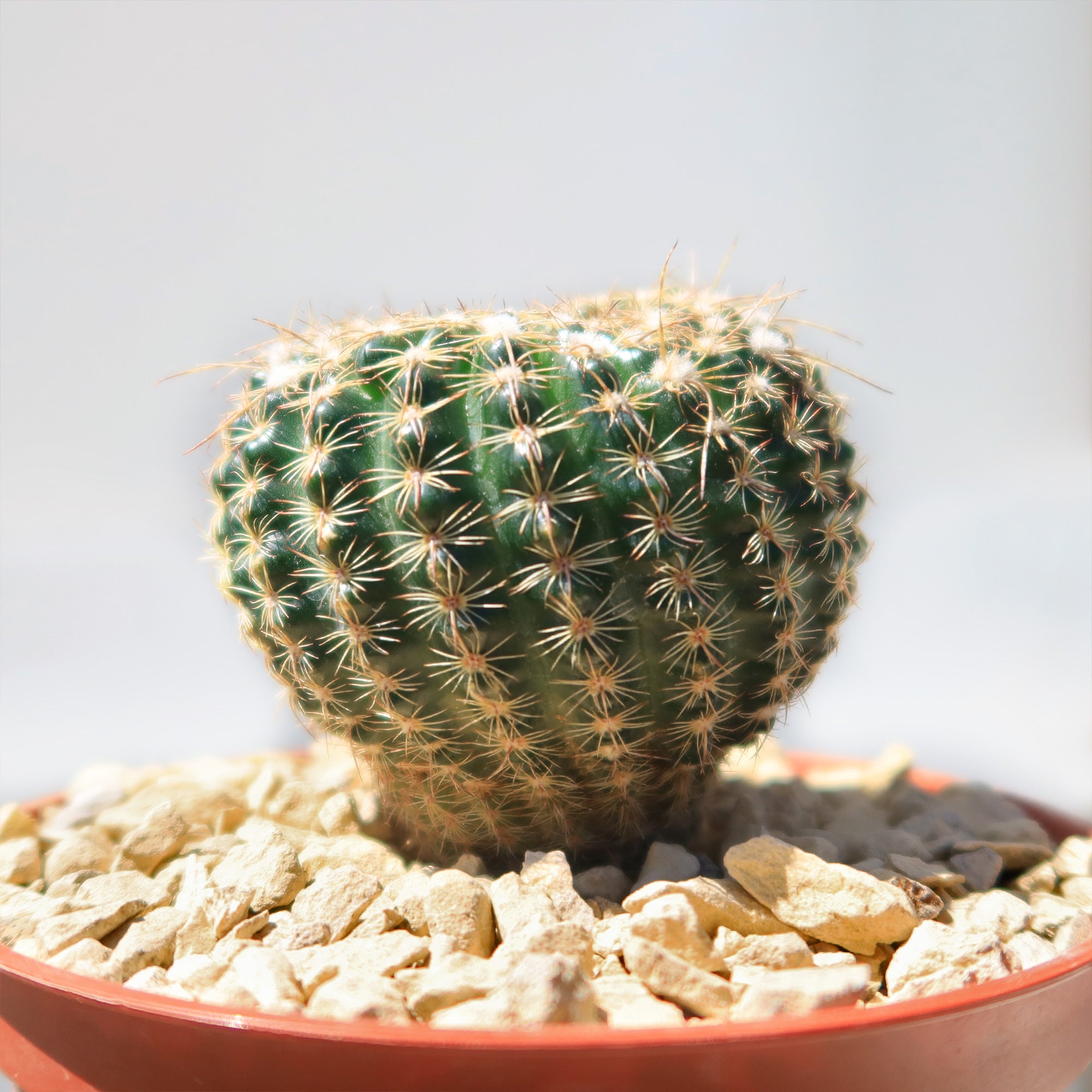 Notocactus are almost always globose, elongating as they age, some species eventually reach 3 feet (90 cm). They are often solitary, rarely offsetting.