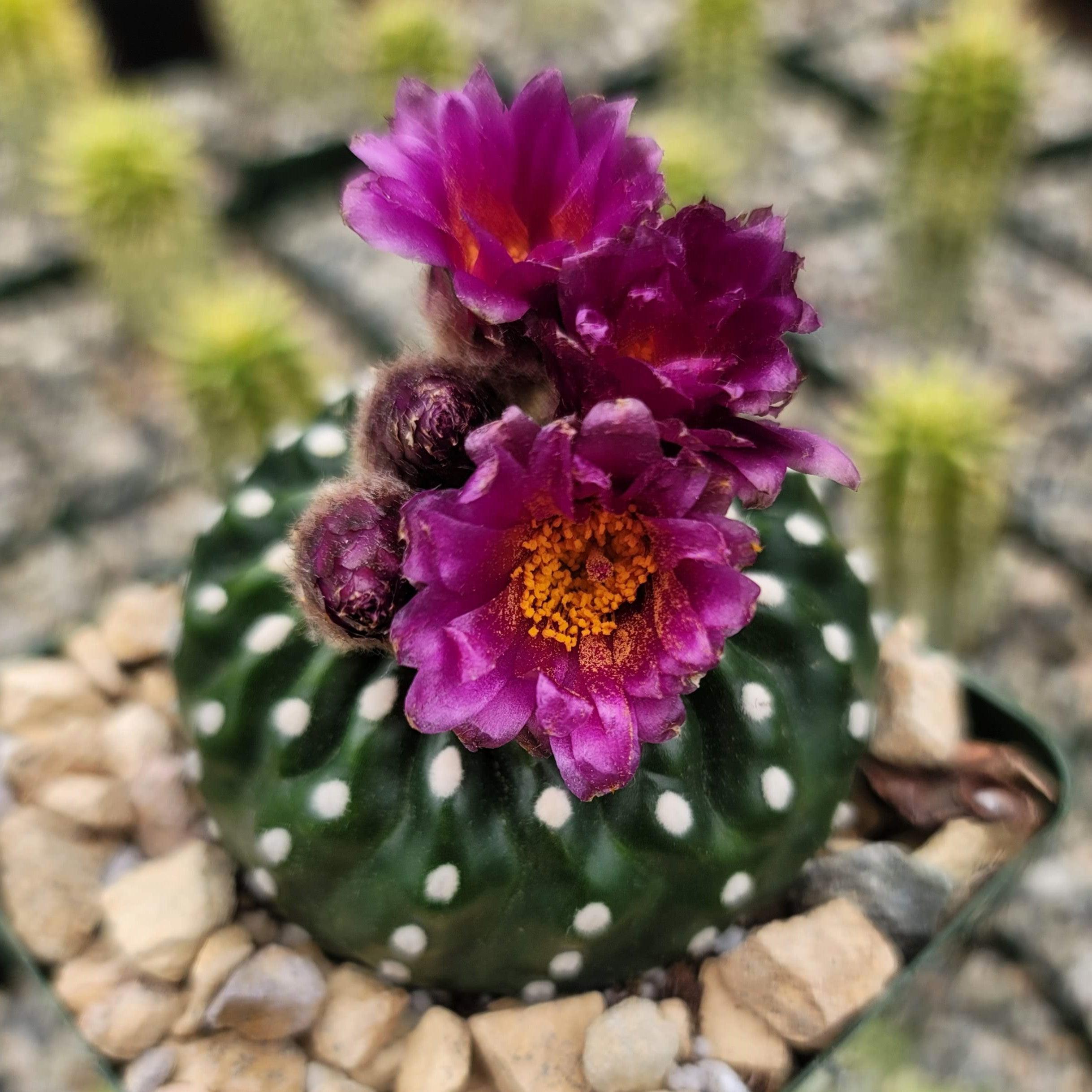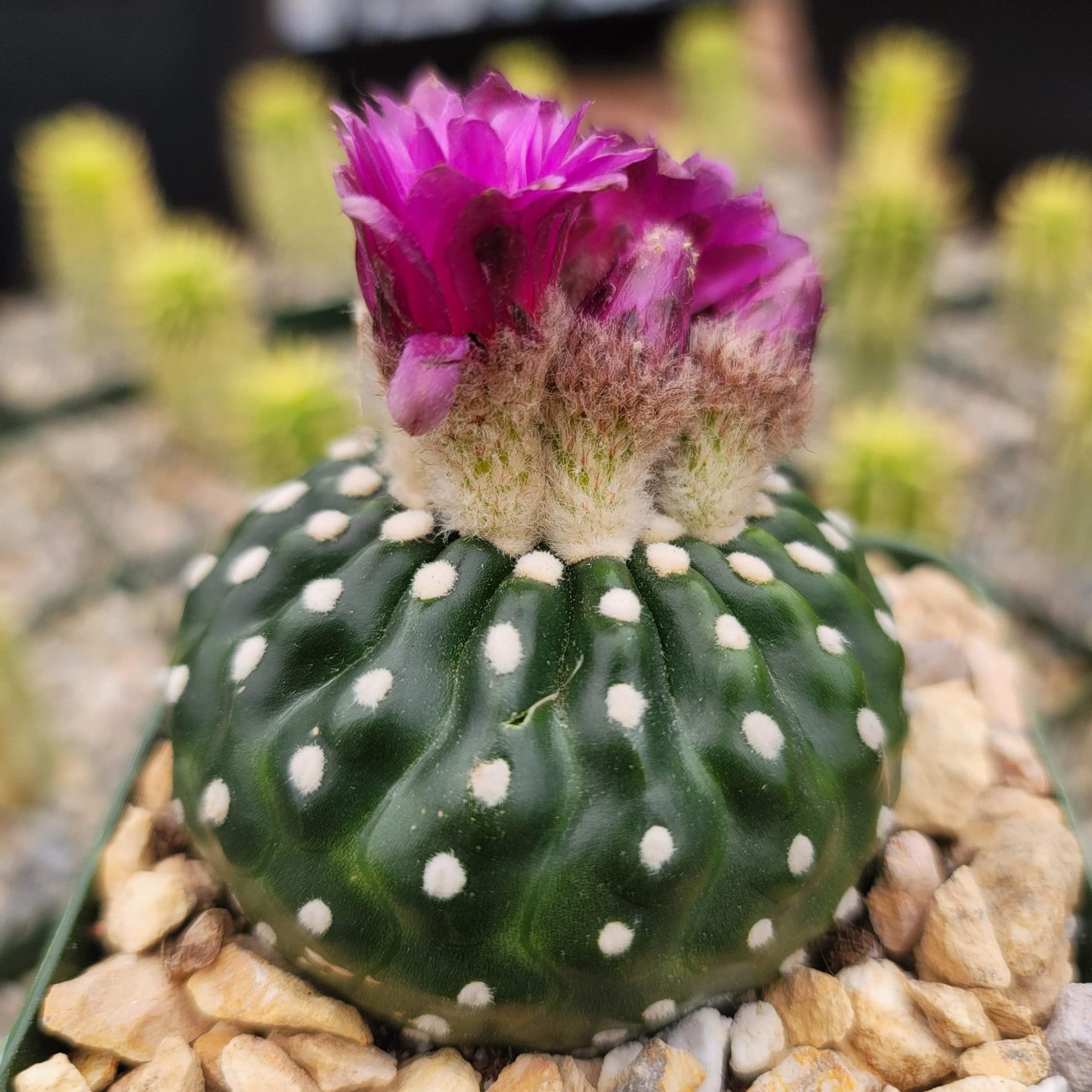 Notocactus uebelmannianus flower has a variety of colors from cream to wine red to deep magenta tints to it. The blooms appear from spring to early summer.