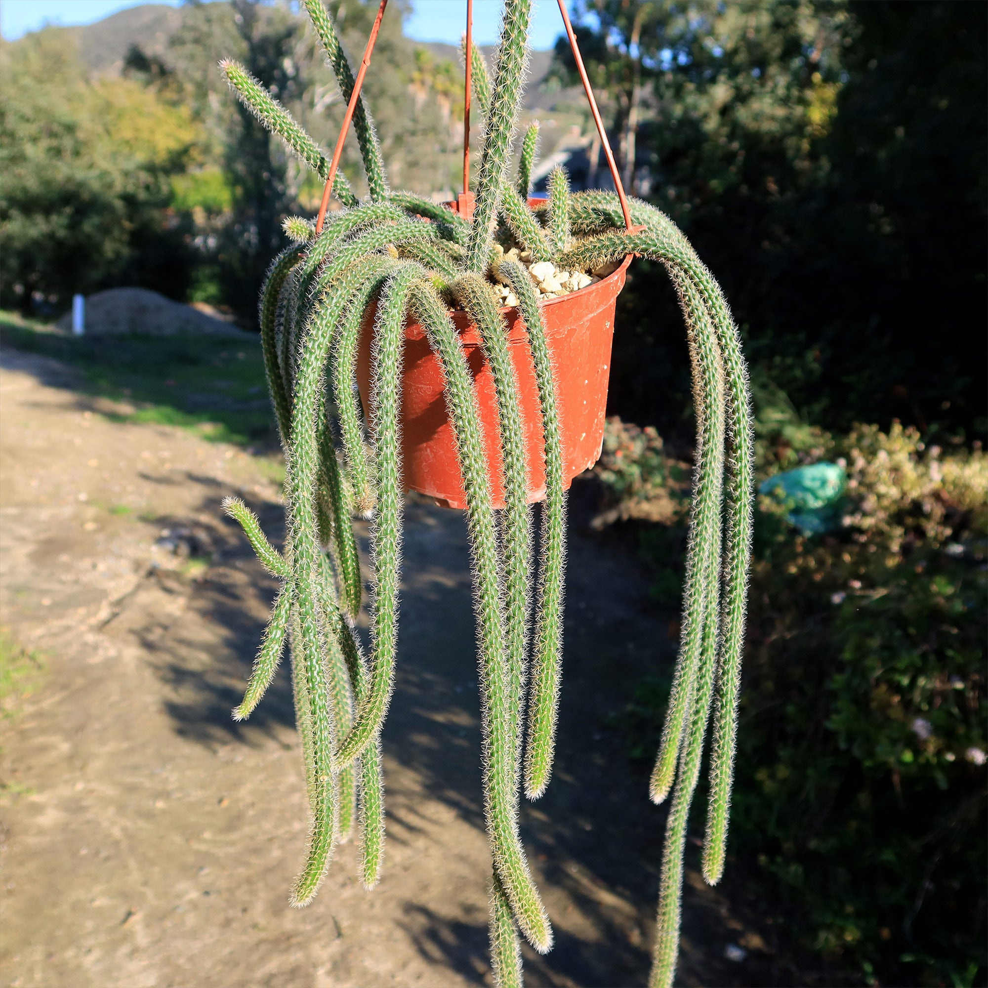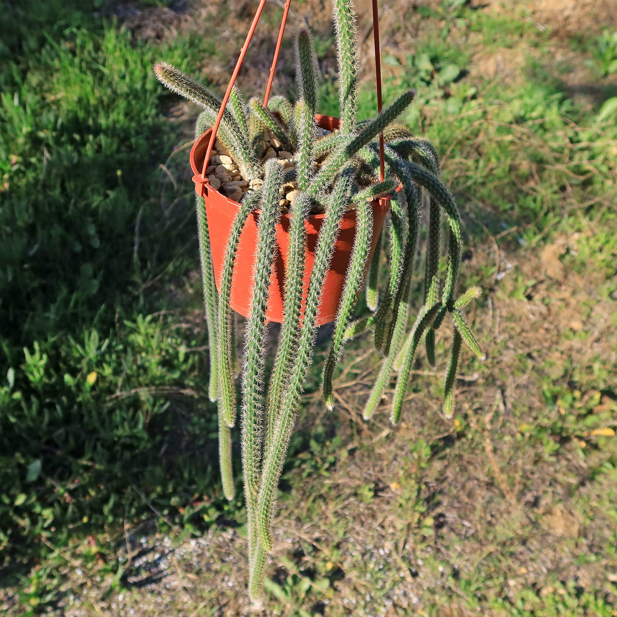 Introducing the rat tail cactus, known as Aporocactus flagelliformis, which is a popular hanging/trailing succulent plant that belongs to the Cactus family. The name "rat tail" is derived from the cactus's distinctive, long, slender stems that resemble the shape and texture of a rat's tail.