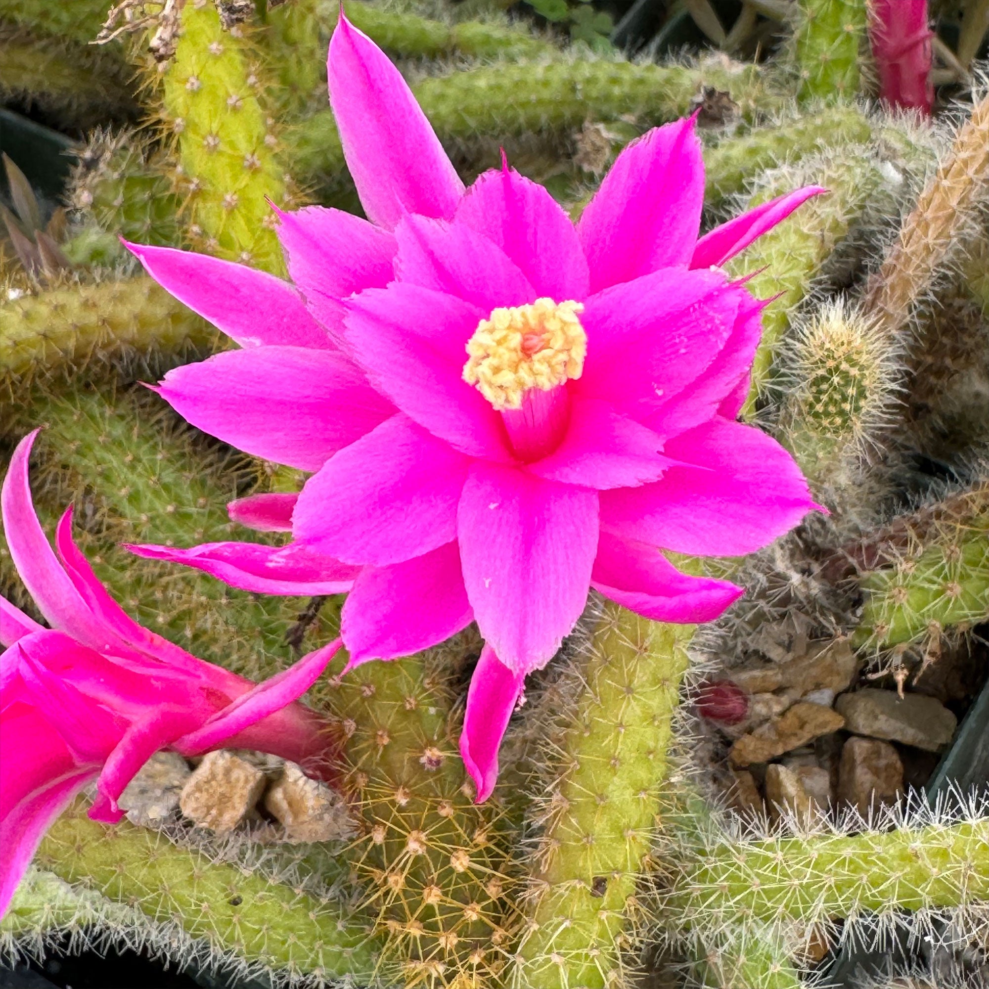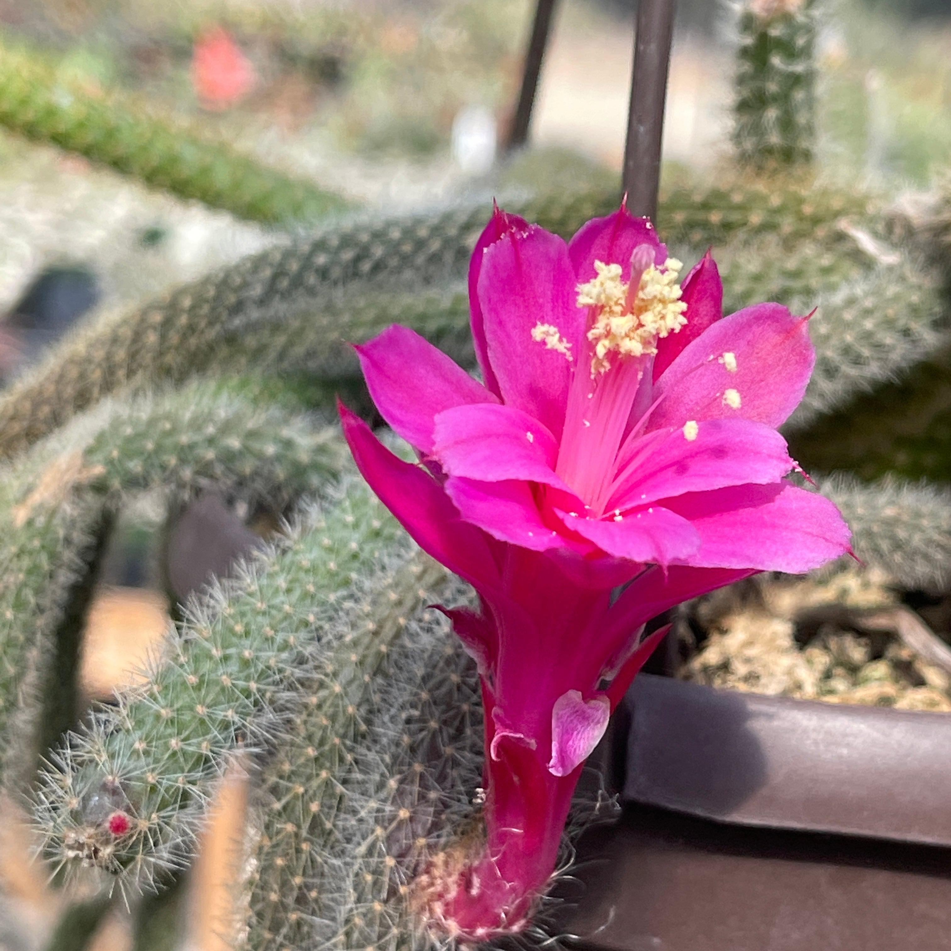 - This cactus produces bright pink to magenta tubular flowers that can reach 3 inches long, often blooming in late spring or early summer.