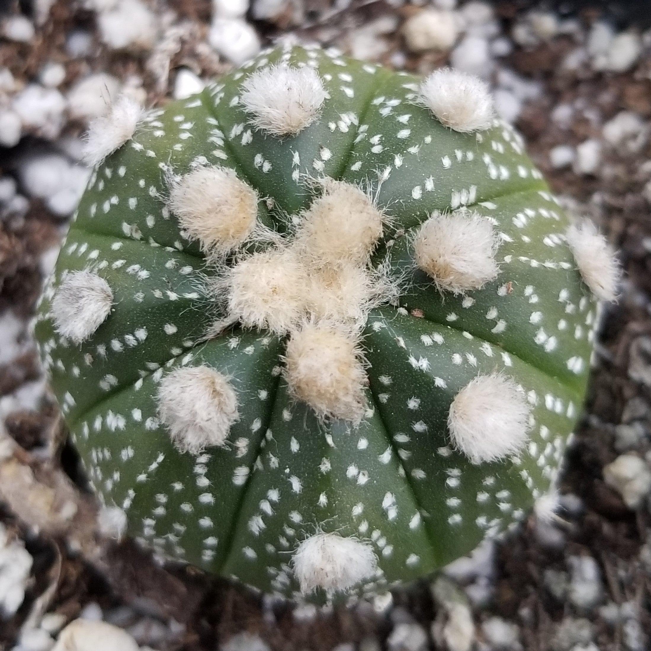 Overall, the Astrophytum asterias (Sand dollar cactus) is a unique and fascinating plant. It features a distinctive star-shaped pattern on its stem, which gives it a truly eye-catching appearance. This cactus is relatively low-maintenance and can thrive both indoors and outdoors, as long as it's provided with the right conditions. It prefers temperatures between 65 and 80 degrees Fahrenheit indoors, and it's best suited for hardiness zones 9 to 11 outdoors. With proper care, including well-draining soil, occasional watering, and protection from frost, the Astrophytum asterias can bring a touch of celestial beauty to your plant collection.