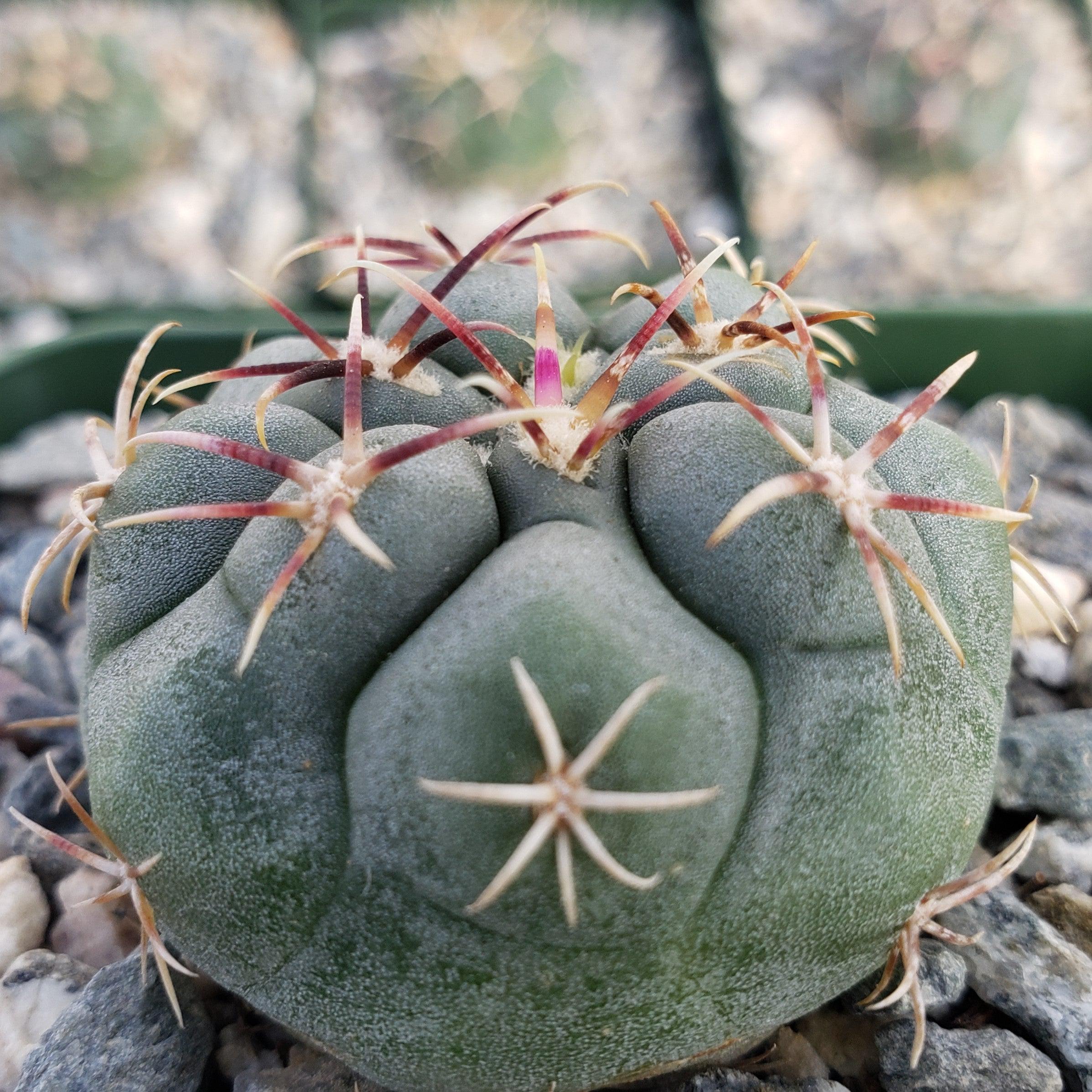 Thelocactus lloydii major is a solitary and strongly armed cactus with depressed and globose form. It is a grey to bluish-green cacti. It has reddish-white-brown central spines that have sharp yellowish-crimson tips. It grows up to 8-12 cm broad . It blooms a light pink to almost white with a darker midline. The stigma is a pinkish to yellowish coloring. This summer growing species is easy to cultivate.