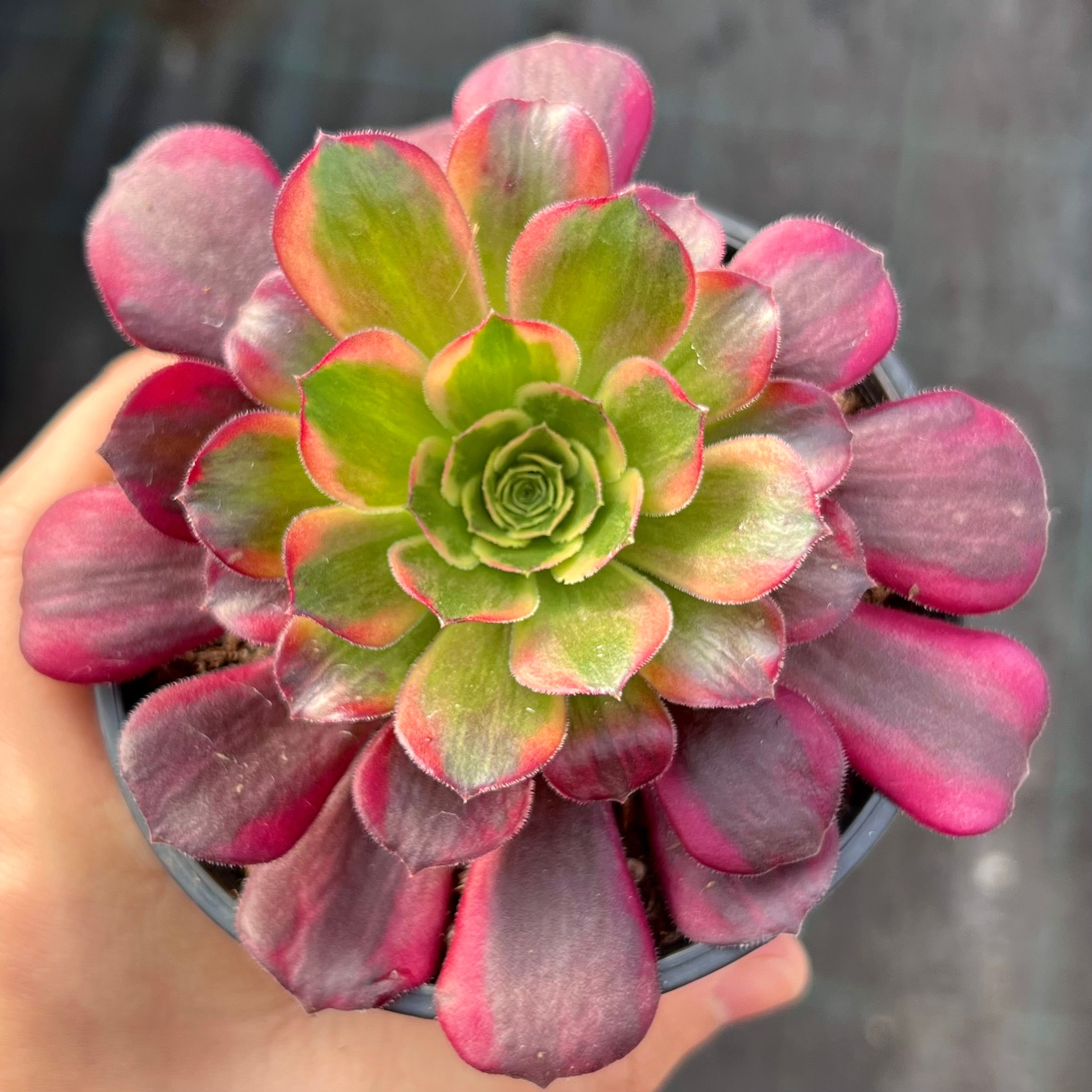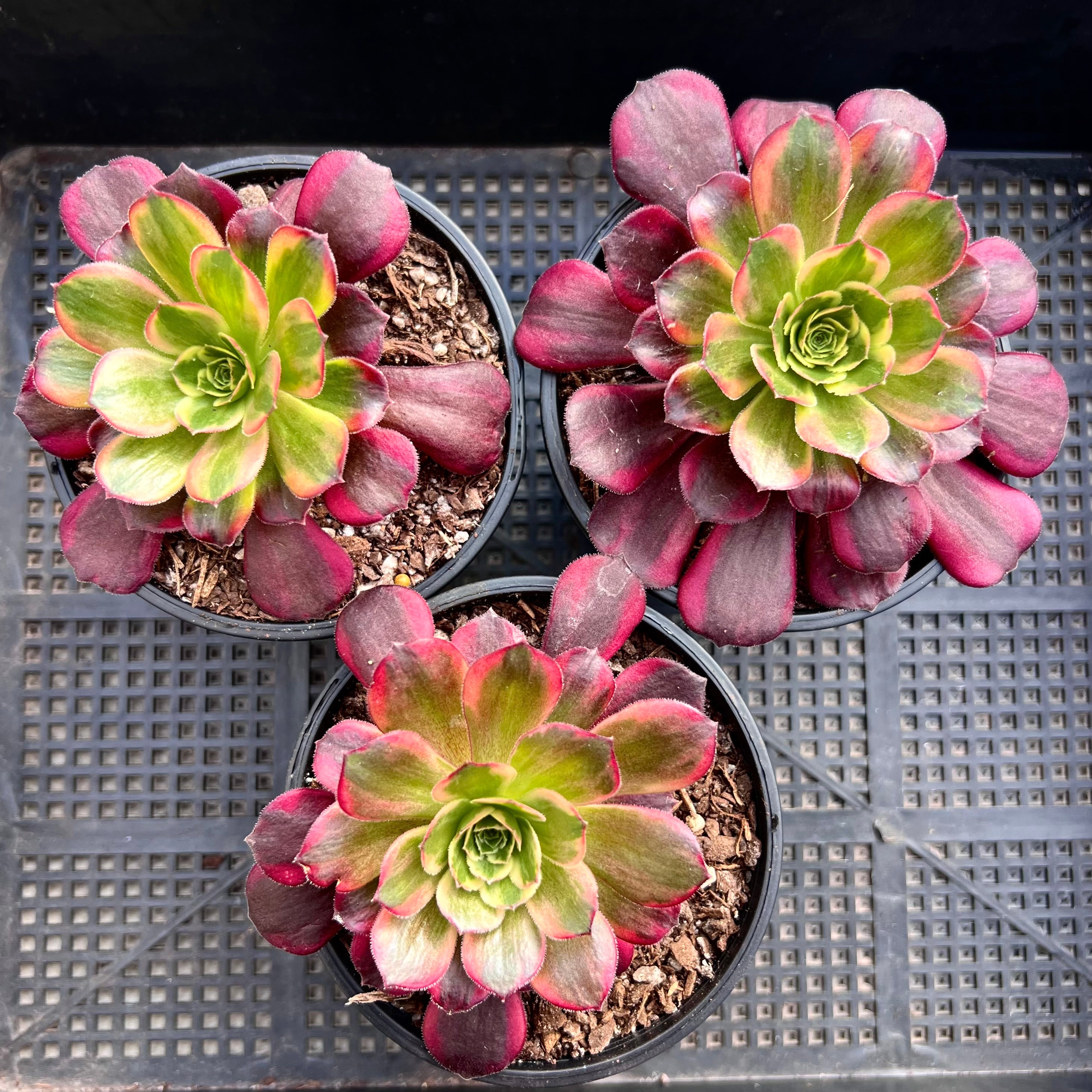 Aeonium Anna has unique large green center and purple/pinkish edges. Prefers full sun.
