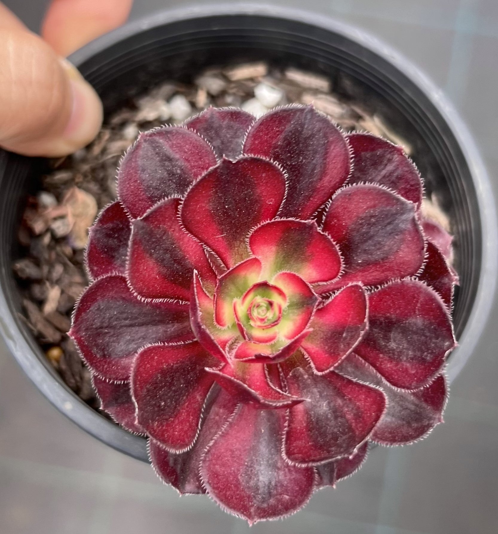 Aeonium Chanel is a vibrant variegated Aeonium variety. It is also known as Aeonium 'Cornish Rose'. The striking red edge remains prominent in different growing conditions. Prefers full sun. This is a cool season grower.