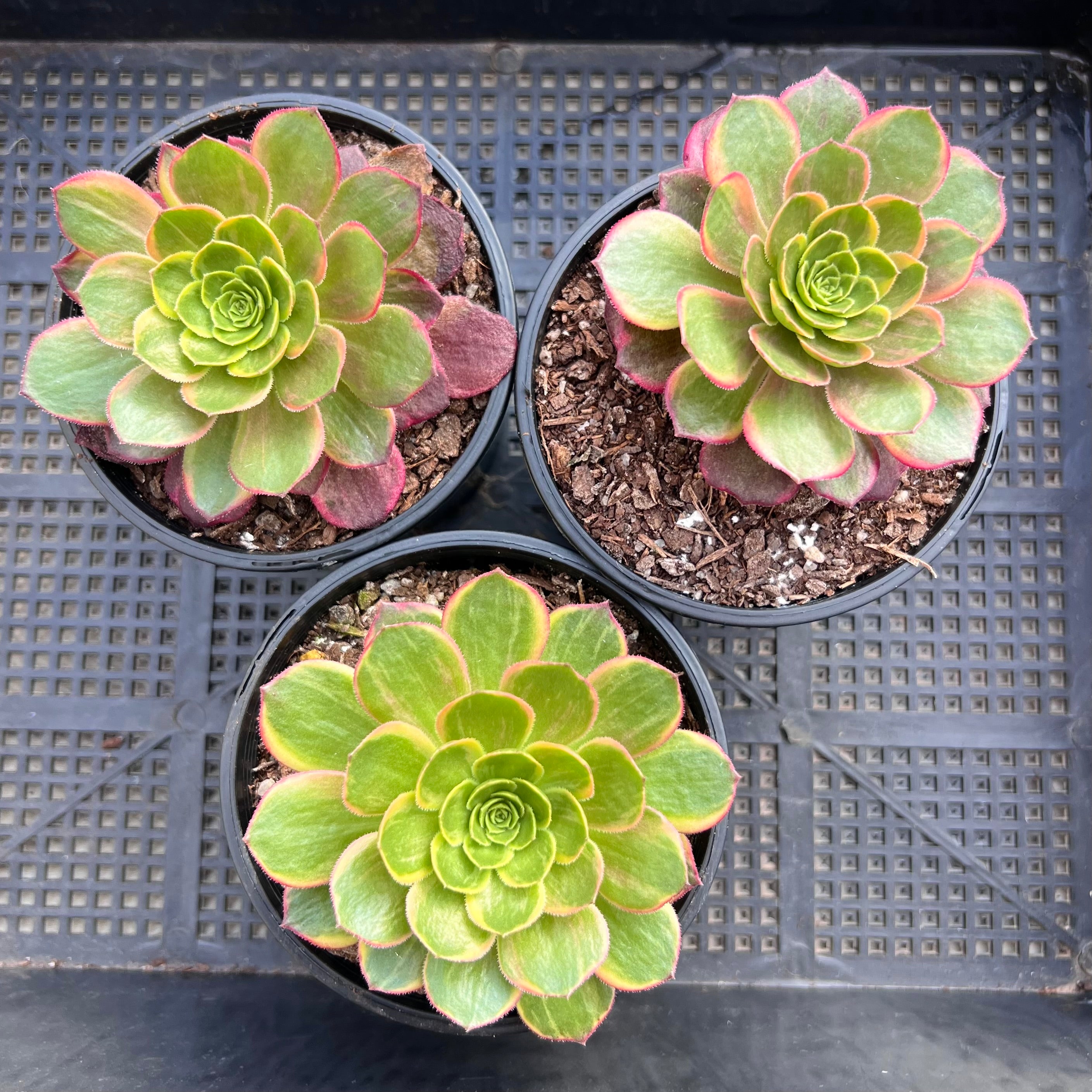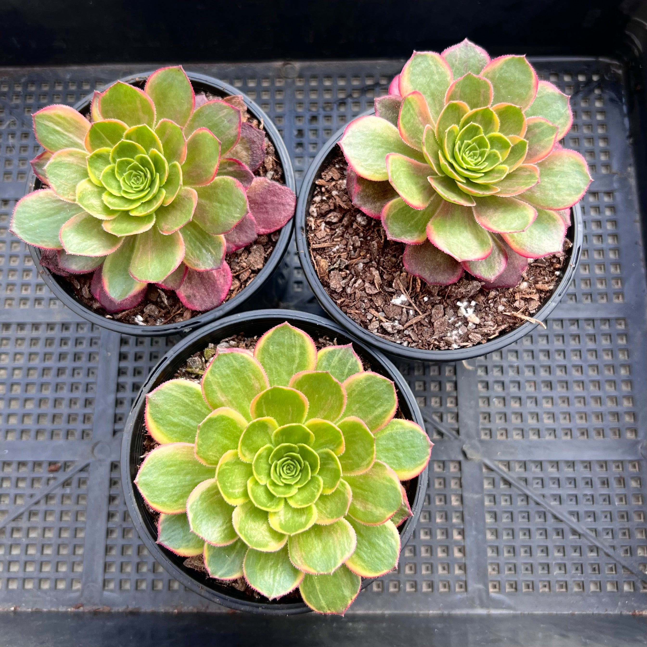 Round purplish rosette with splashes of yellow and green. Prefers full sun.