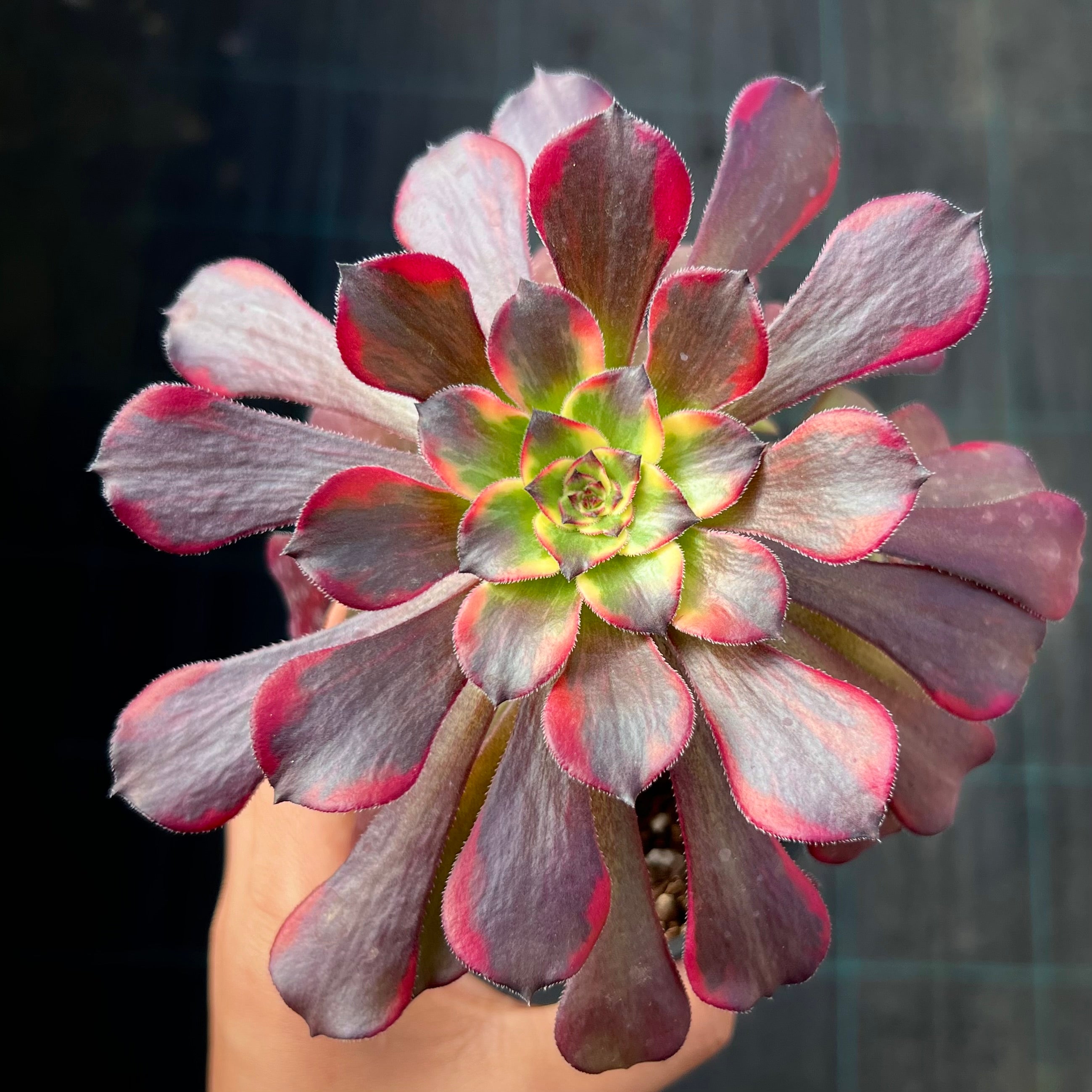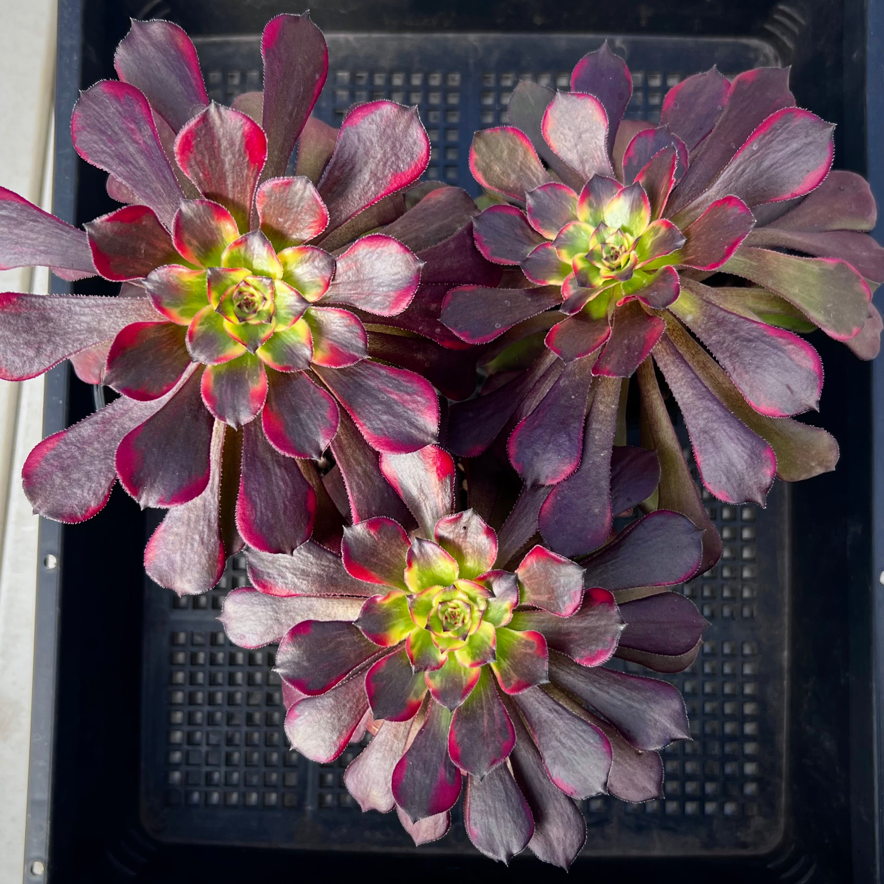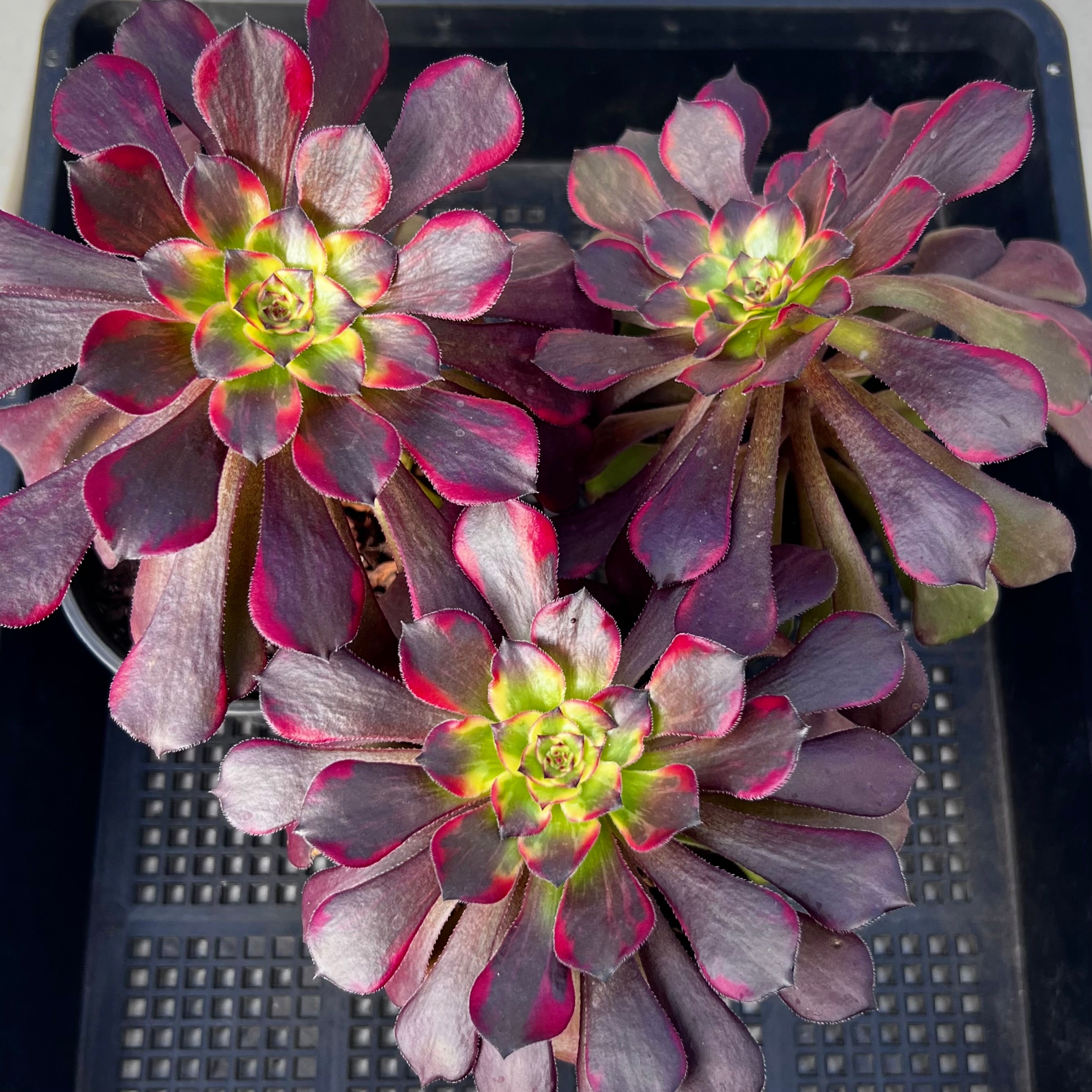 Aeonium white chocolate line has beautiful dark rosette. It is very similar to Aeonium Black Devil and Fireworks. They could be the same plant sold under different names by different sellers. Prefers full sun, winter grower.