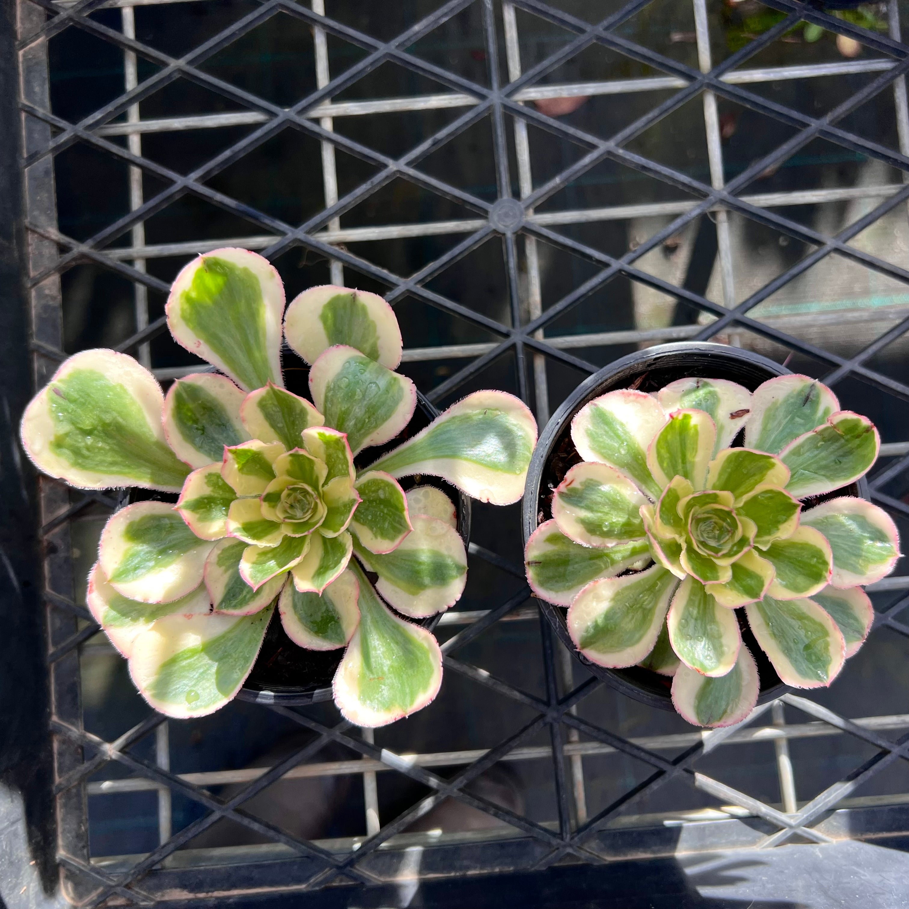 Aeonium Zeus has impeccable form and bright yellow / green color. This variety grows very large and the leaves become more wavy as the plant matures. Prefers full sun.