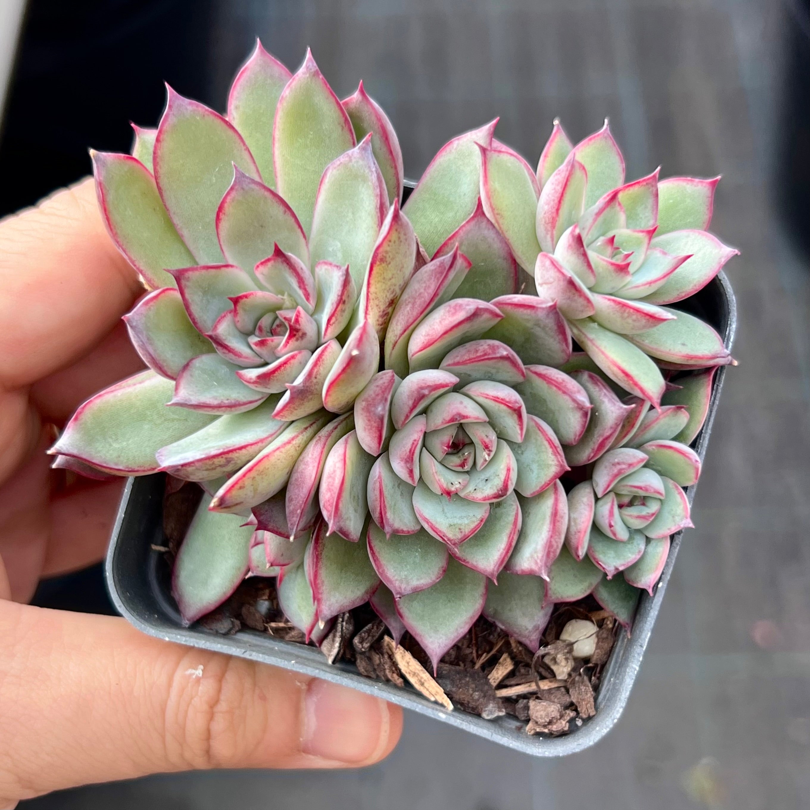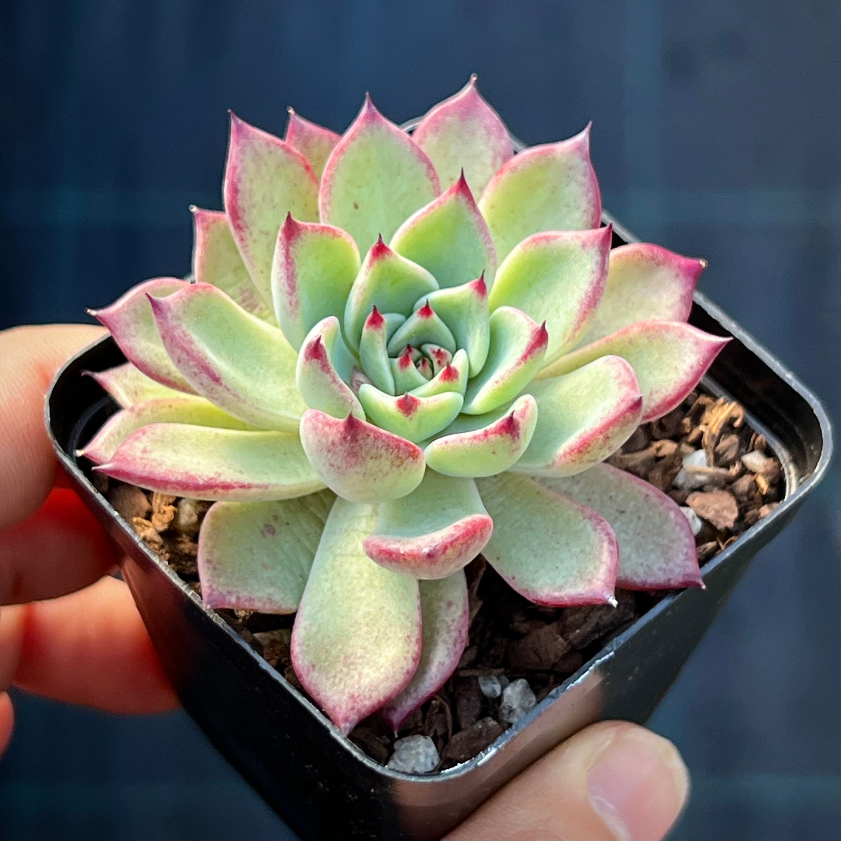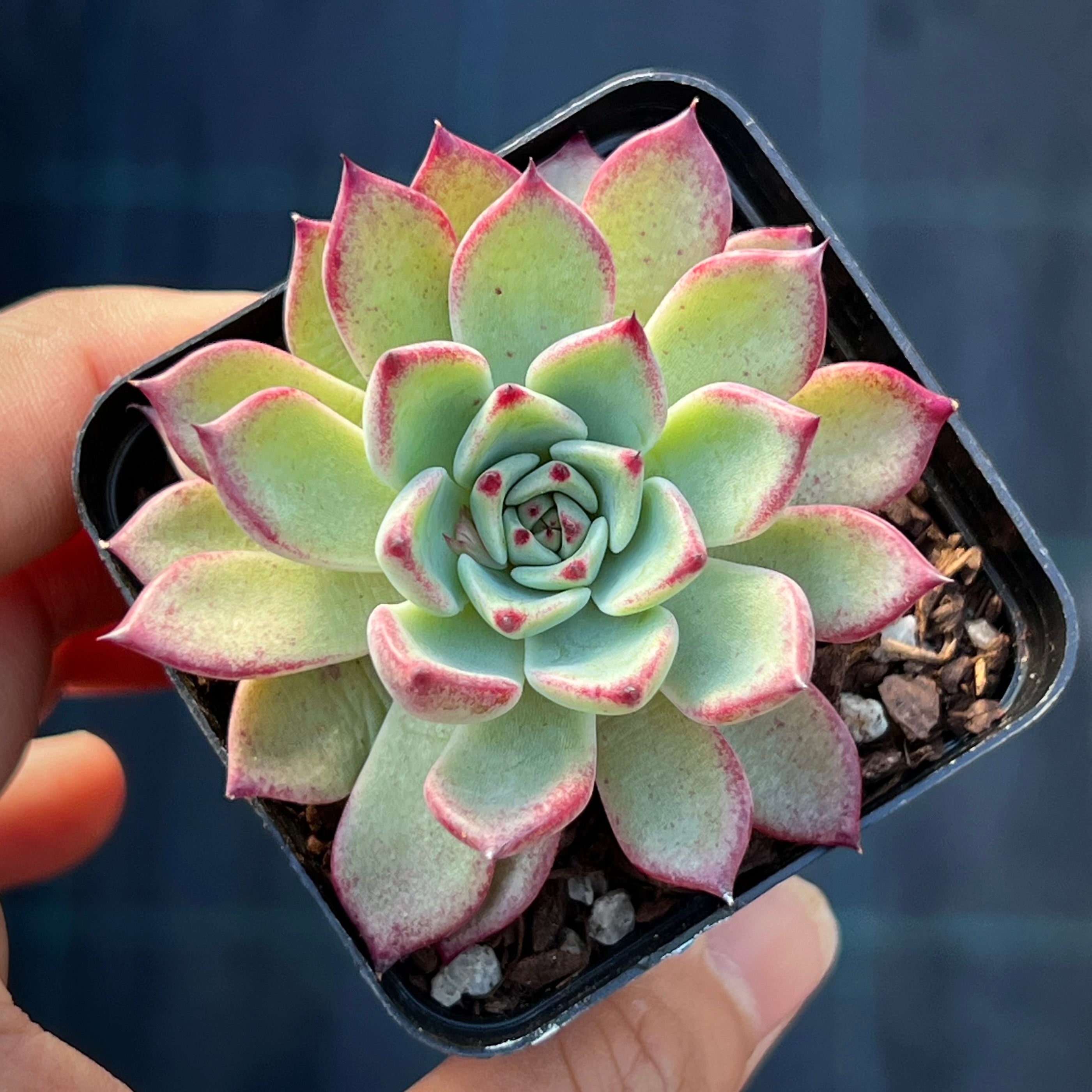 This exquisite hybrid elevates the charm of its parent Sarahime Botan with intensified coloration. Tight rosettes feature plump, powder-blue leaves dramatically edged in deep magenta—a hue that spreads toward the center. Prefers full sun.