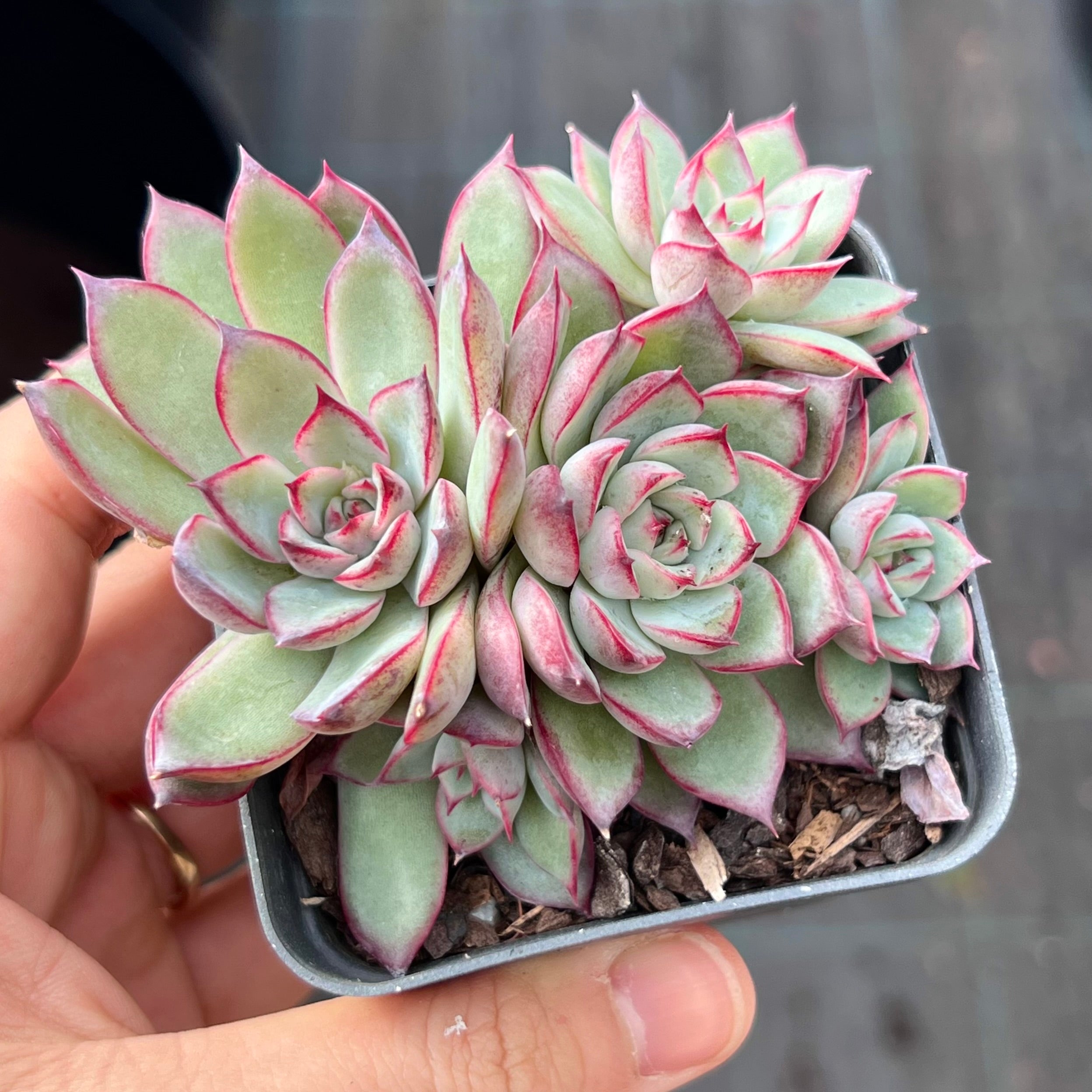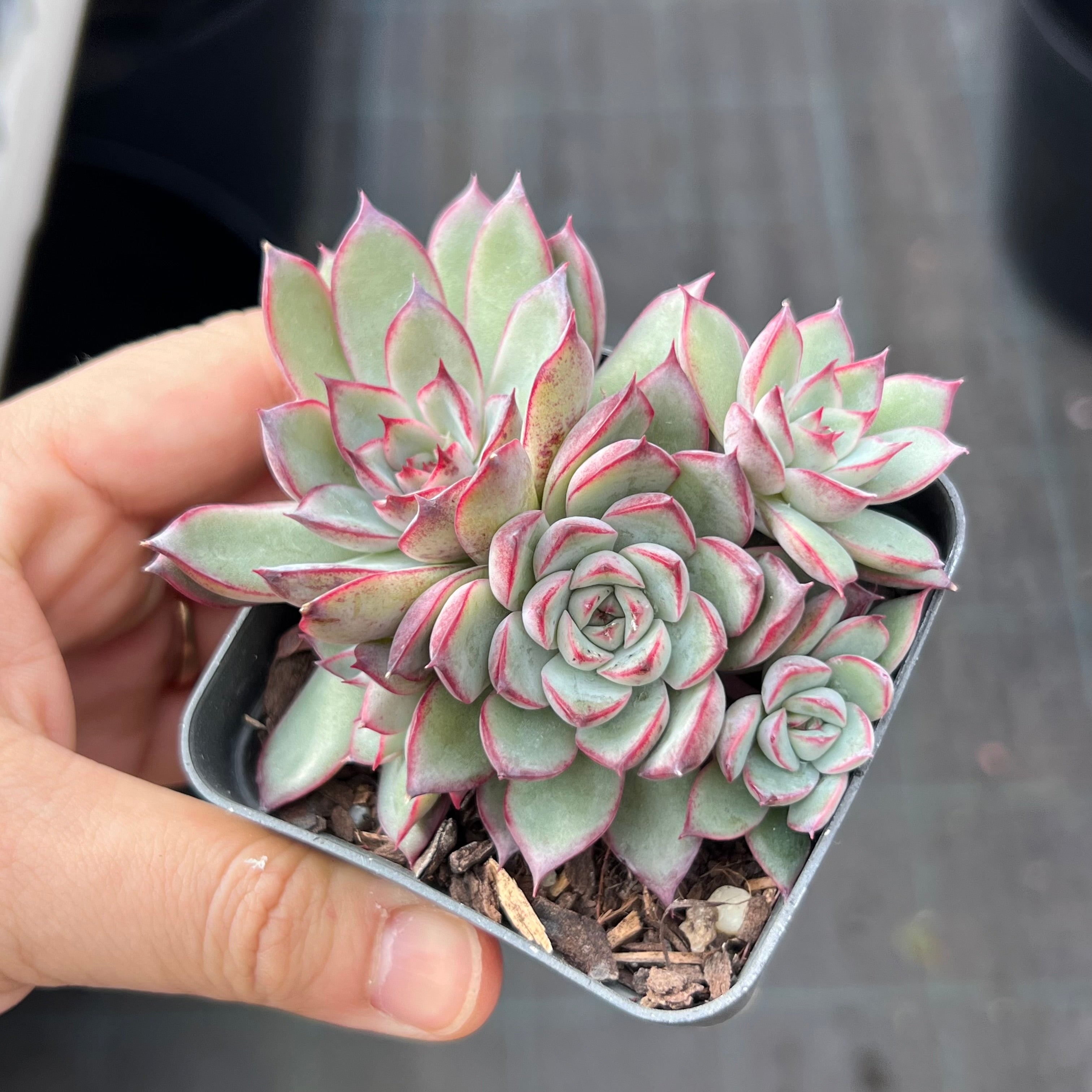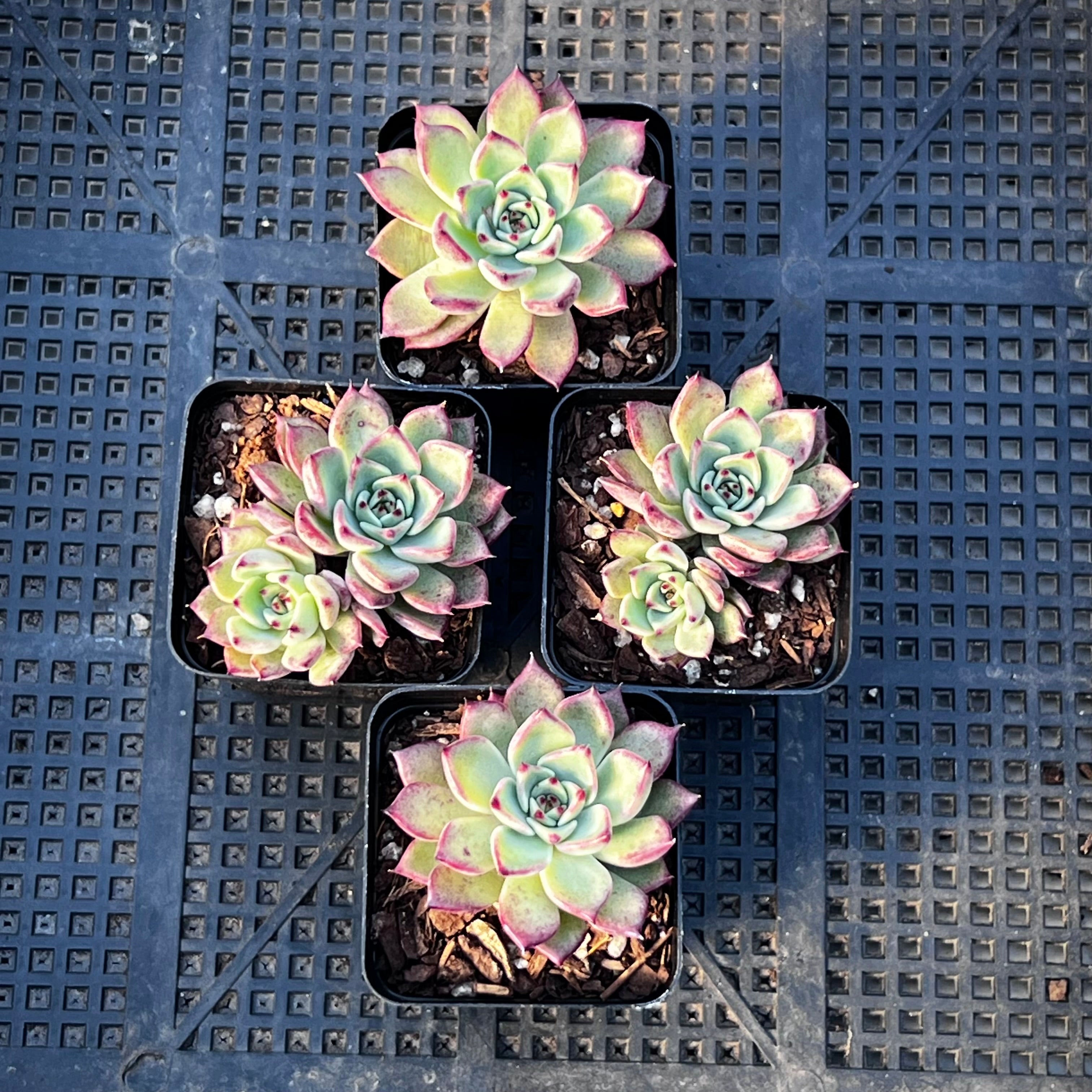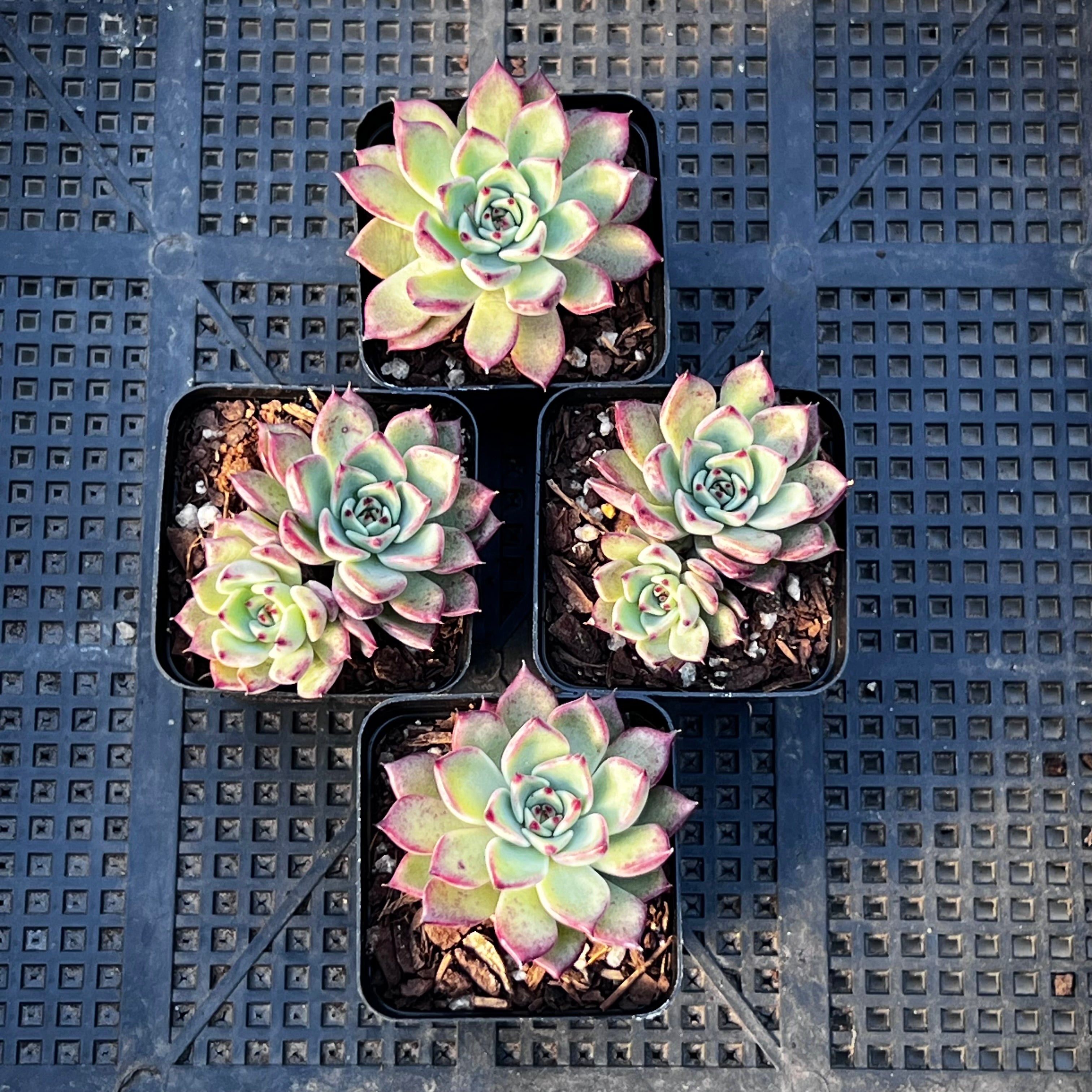 This exquisite hybrid elevates the charm of its parent Sarahime Botan with intensified coloration. Tight rosettes feature plump, powder-blue leaves dramatically edged in deep magenta—a hue that spreads toward the center. Prefers full sun.