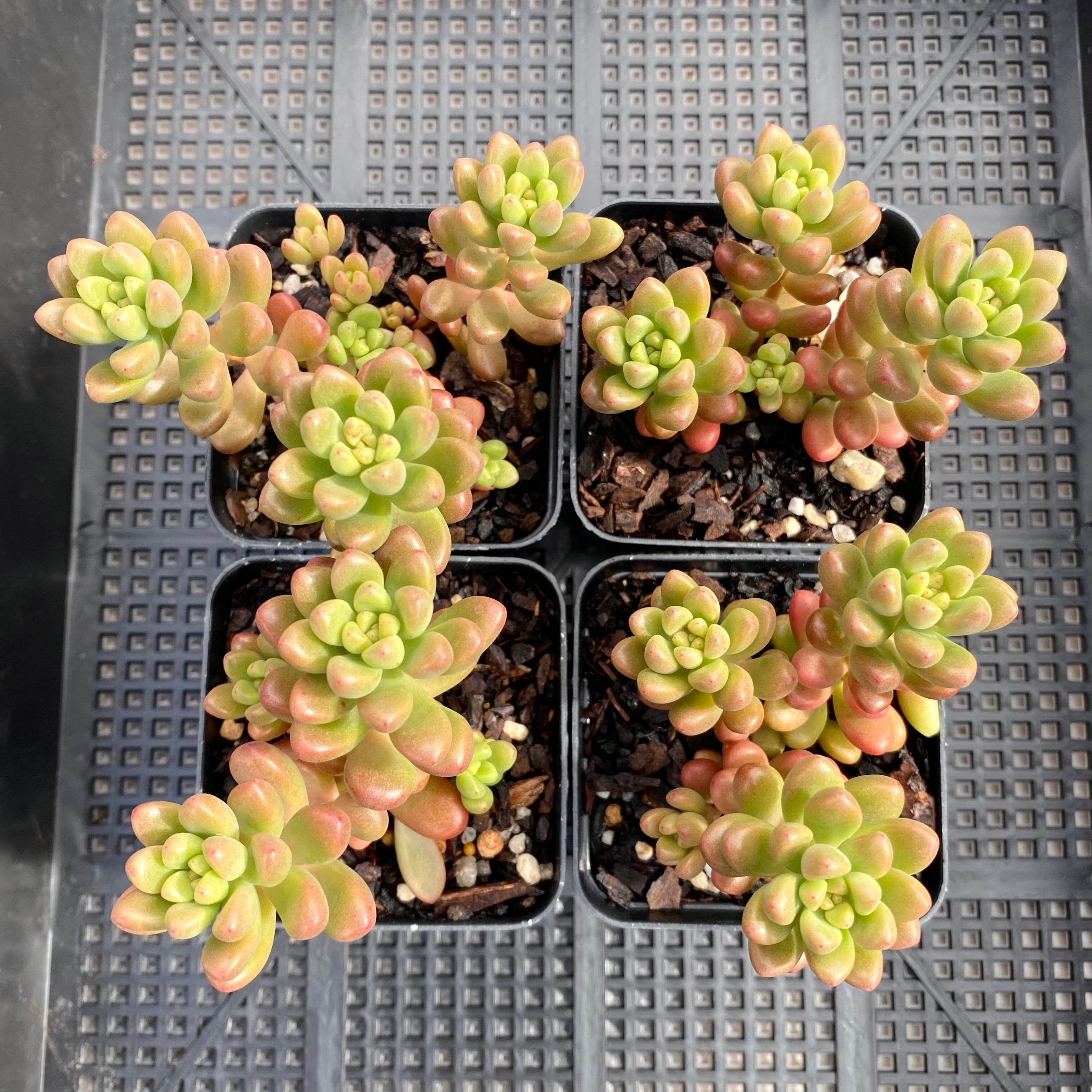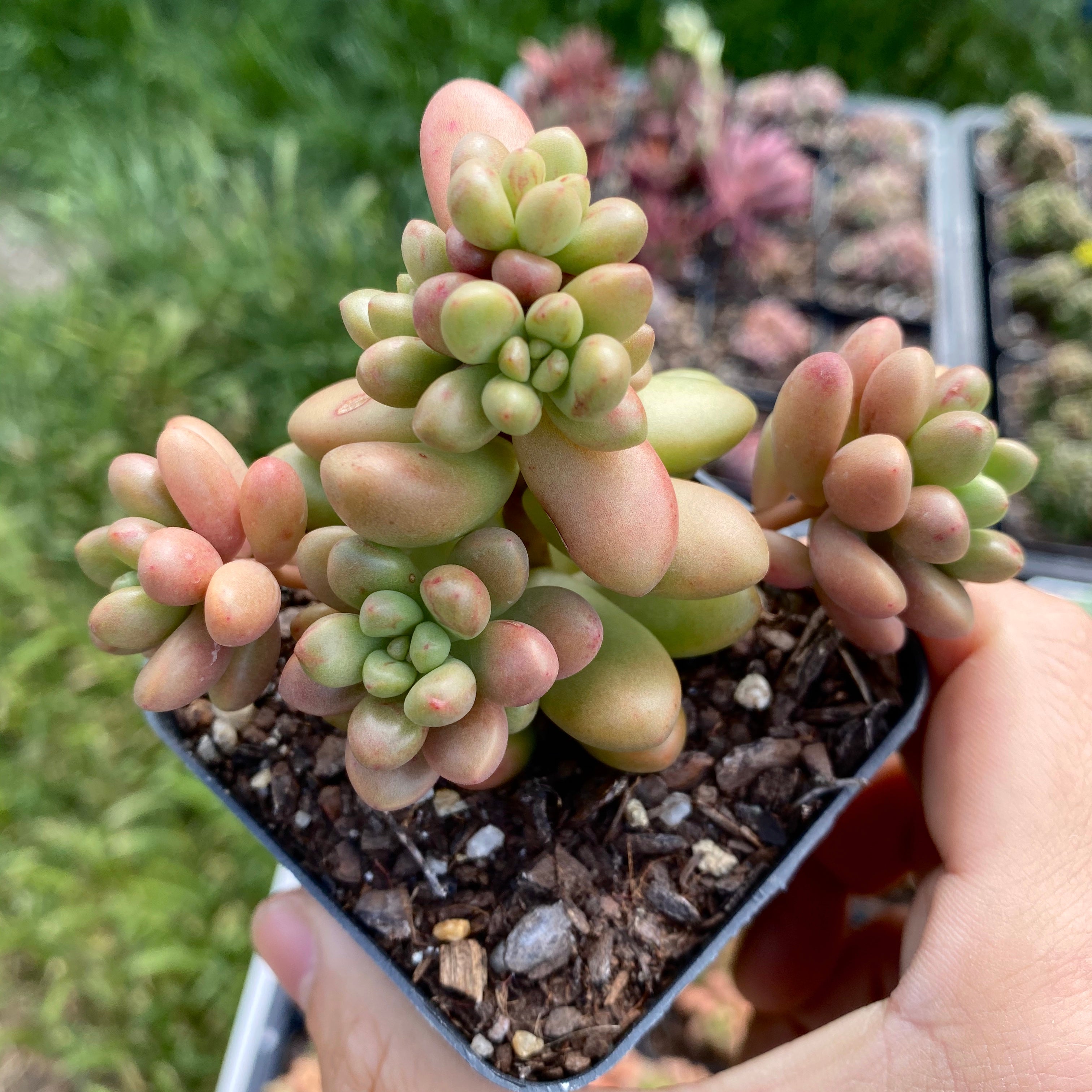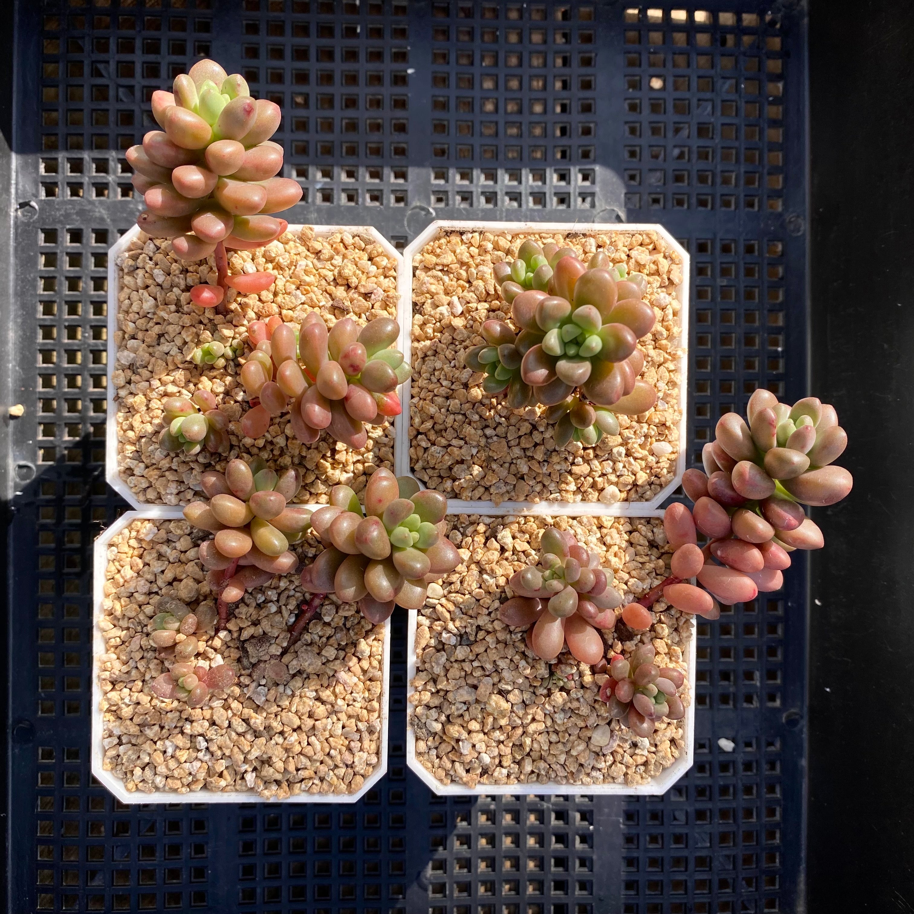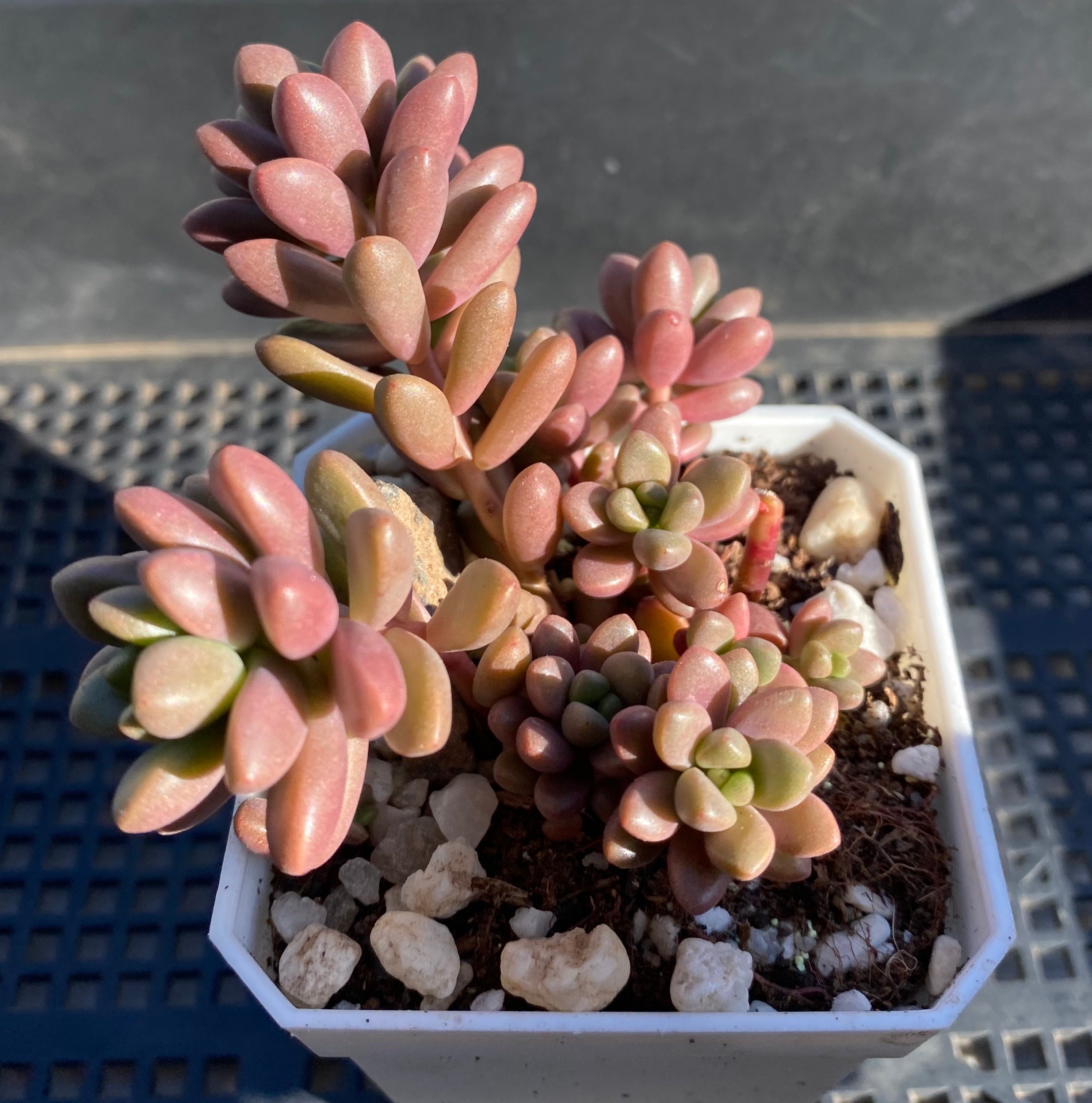 赤豆白石是一个小型的景天品种,叶片圆润,平时为绿色,出状态的时候变棕红。喜全阳,容易群生,很好养护。